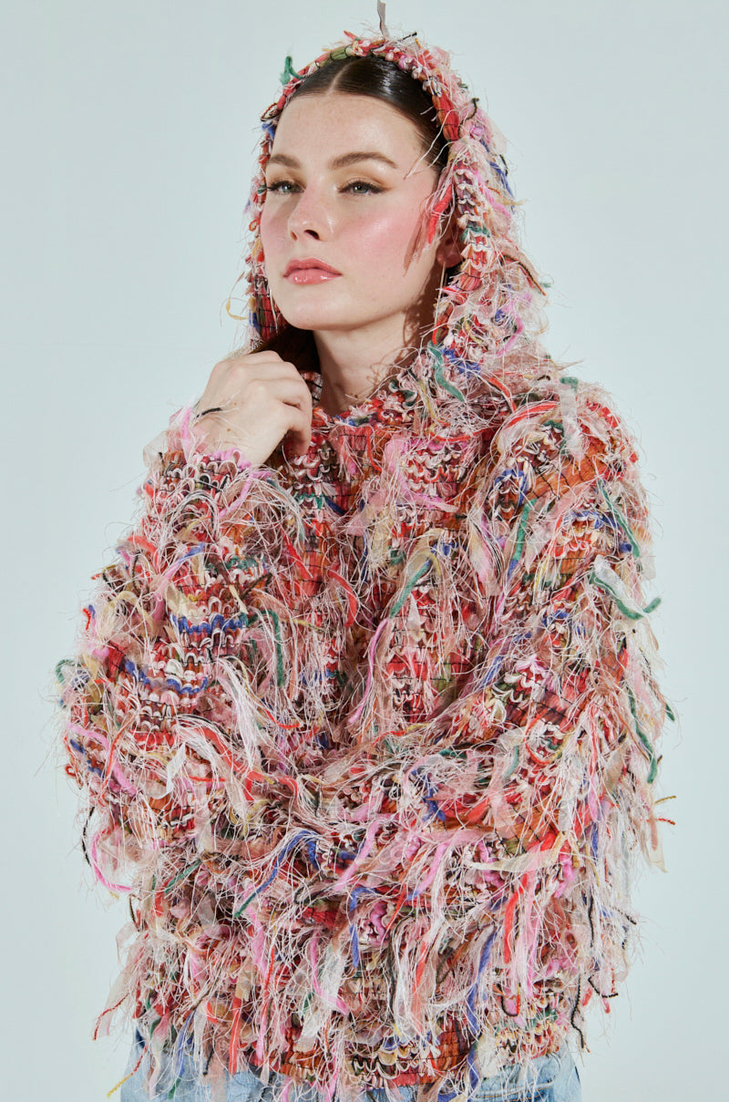 It's time to lock in with The AKIRA Label All Over The Place Fringe Sweatshirt. This whimsically chic piece is crafted from a stretchy. sheer mesh fabrication and features an attached hood. long sleeves with coordinating elasticized cuffs. and panels of colorful fringe trim and yarn detailing throughout its entirety. Complete with a cinched waist. an oversized silhouette. and a pull-on fit. Pair with baggy cargo denim pants and platform sneakers to unleash your inner wild child.