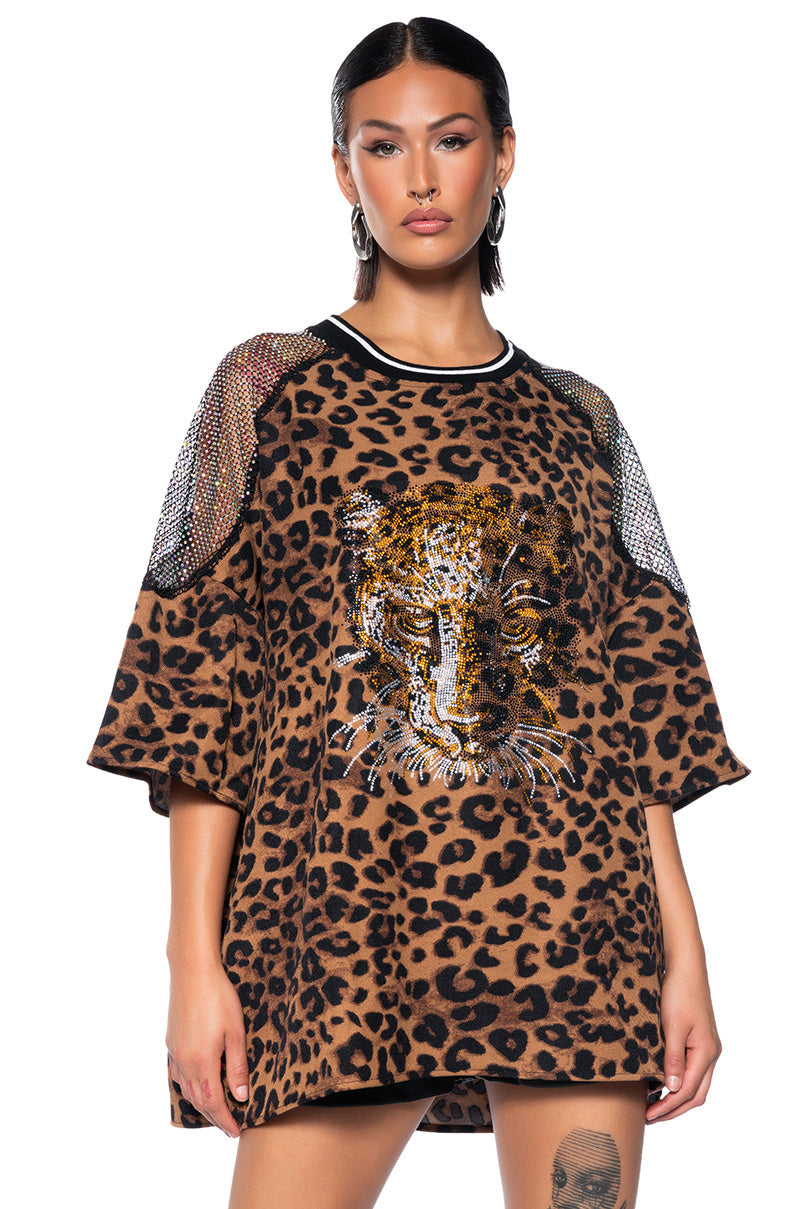 We have infinite love for The AWNIS Label Always N Forever Short Sleeve Print T Shirt. This subtly textured knit top features animal print patterning throughout. a sporty ribbed knit crew neckline. short sleeves. and a boxy. oversized silhouette. Complete with cut out rhinestone mesh shoulder detailing and a rhinestone-embellished leopard chest graphic. Style this piece with a faux leather mini skirt and thigh high boots to complete your graphic streetwear look!