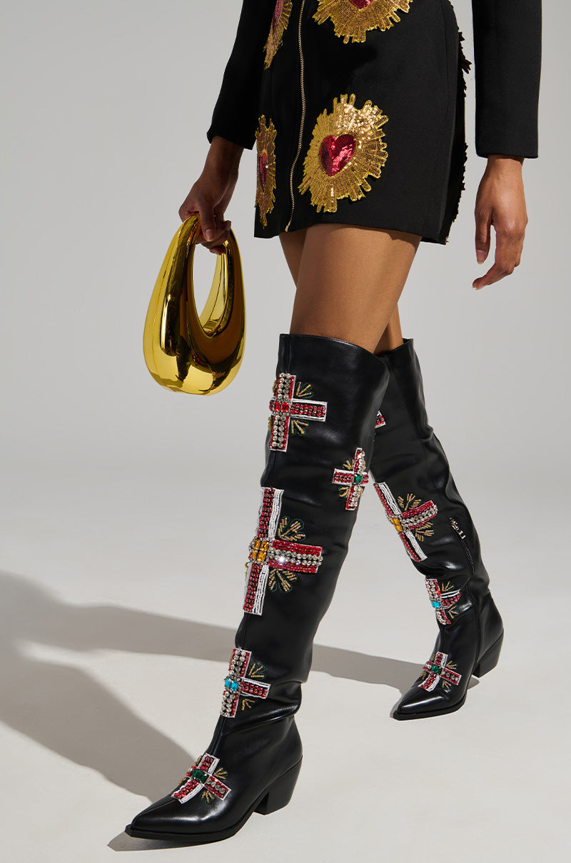 Classic meets contemporary. Nail the Western trend with The AZALEA WANG Jazlyn Black Rhinestone Embellished Western Boot. This over-the-knee pair features a buttery faux leather upper. a pointy toe silhouette. and a chunky stacked heel. Complete with Western-inspired embroidered accents. beaded detailing. rhinestone embellishments. and a tonal inner ankle zipper closure.