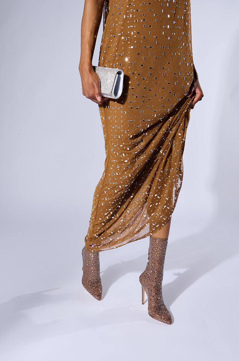 The AZALEA WANG Sadira Brown Bootie is the shoe of the season. every season. These luxe booties boast a stretchy sheer mesh textile upper. a pointed toe. a mid-calf shaft with elastic trim. a slim stiletto heel. and a Comfort Cushion insole. Complete with faux leather detailing on the back ankle and heel. various shaped rhinestone detailing throughout. and a slip-on fit. Style with leather pants and a corset top for a super sexy ensemble.