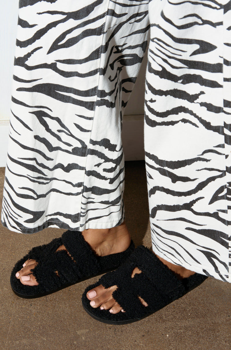 Get your fur on with The AZALEA WANG Vivek Black Fuzzy Slip On Sandal. These cozy cuties are made from a sherpa-inspired textile upper and feature an open almond toe. a wide toe band with cut out detailing. and a plush coordinating insole. Complete with an adjustable velcro foot strap. a flat sole. and a slip-on fit. Pair with oversized sweats and a cropped tee for an effortlessly cuddly ensemble.