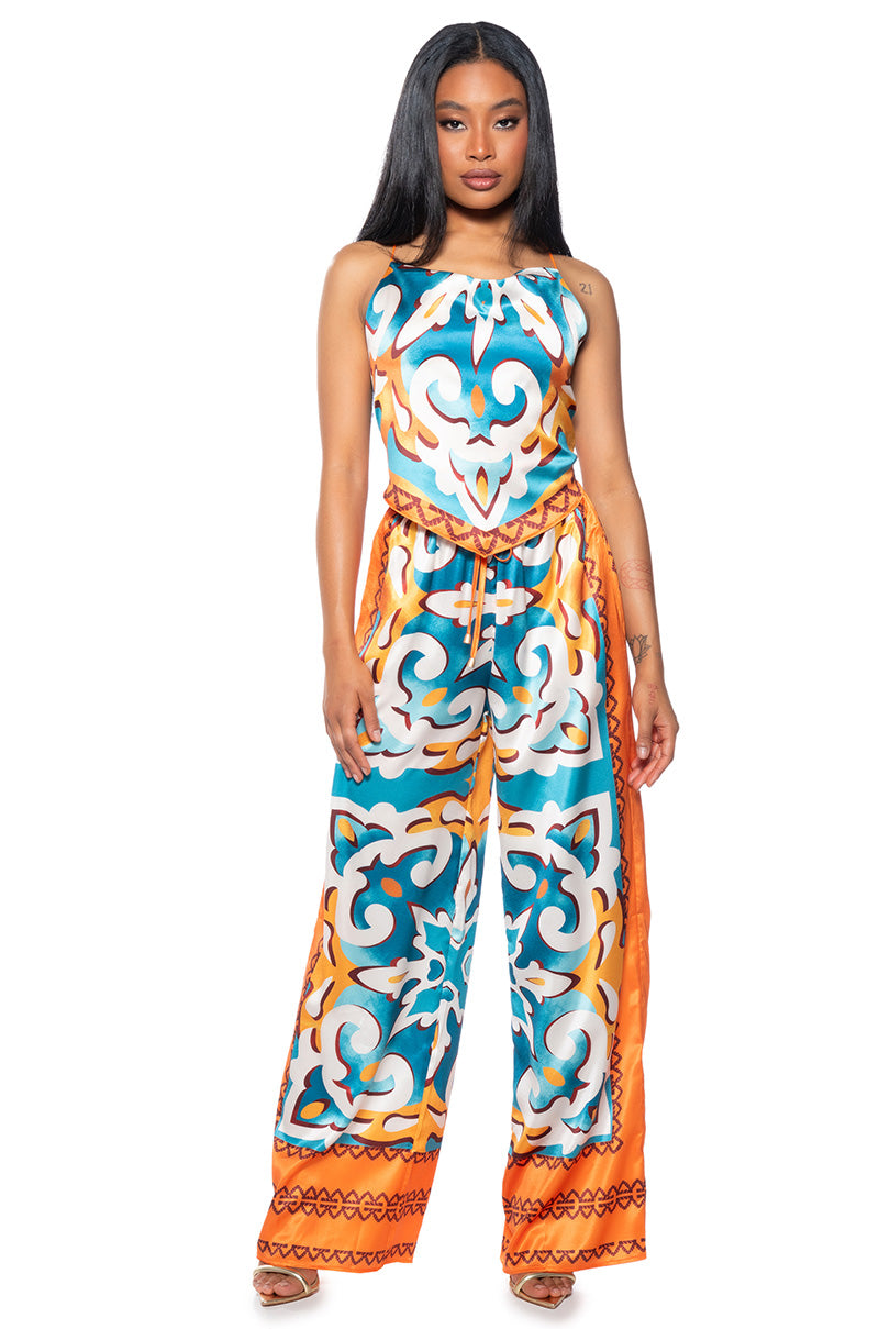 Watch the tide roll away with The AWNIS Label Boardwalk Stroll Handkerchief Top And Palazzo Pant Set! This set is made from a non-stretch satin fabrication and features a bold graphic print. The handkerchief top is complete with a cowl neckline. cross back spaghetti straps. a pointed hem. and a tie back closure. The palazzo pants feature a high rise waist. a shirred elastic waistband with tie detailing. slit side pockets. a wide leg silhouette. and a pull-on fit. Style with mules and colorful sunnies to complete your chic vacay look.