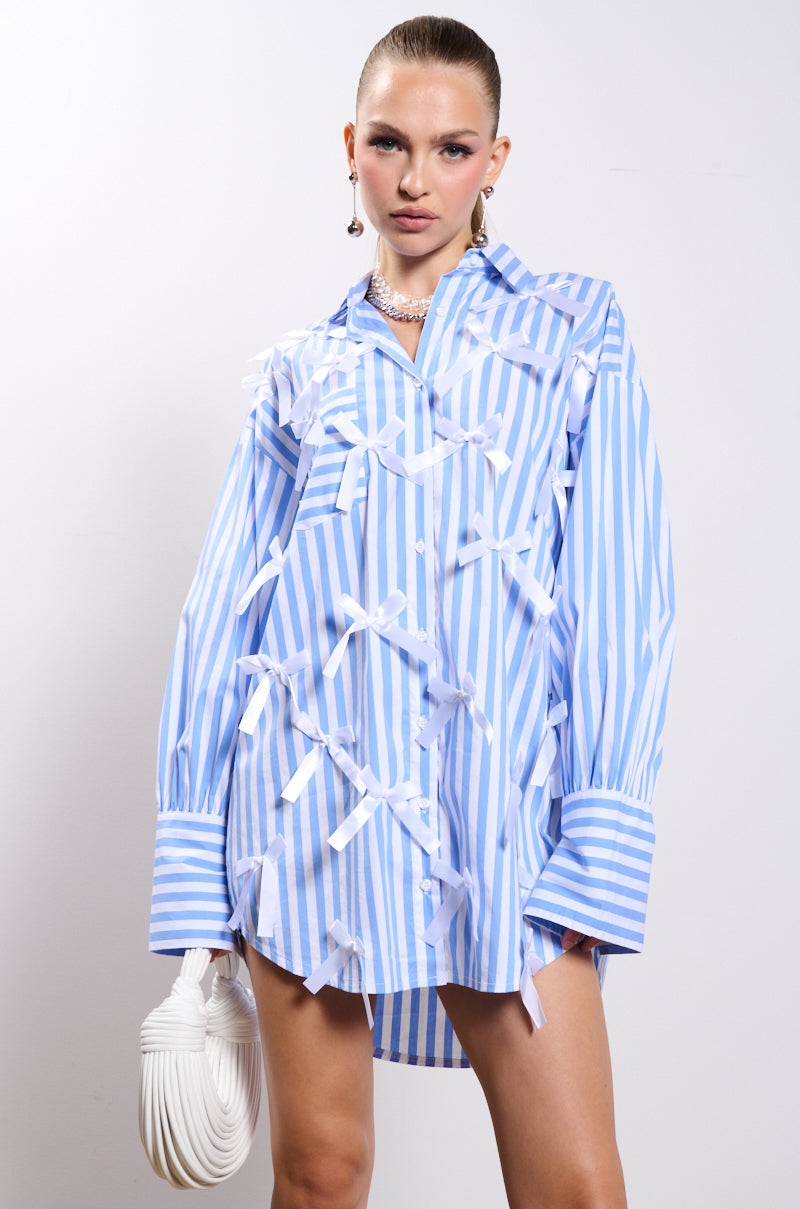 Bow meets beau. Effortlessly blend classic menswear with one of the moment's hottest. girliest trends in The AKIRA Label Bows Striped Poplin Shirt Dress. This airy cotton-blend shirt dress features a tonal button down front closure. fold-over point collar. button-cuff sleeves. and two-tone vertical striping throughout. The face is complete with sweet bow appliques. Style it with strappy sandals and a baguette purse for a flirty. feminine finish.