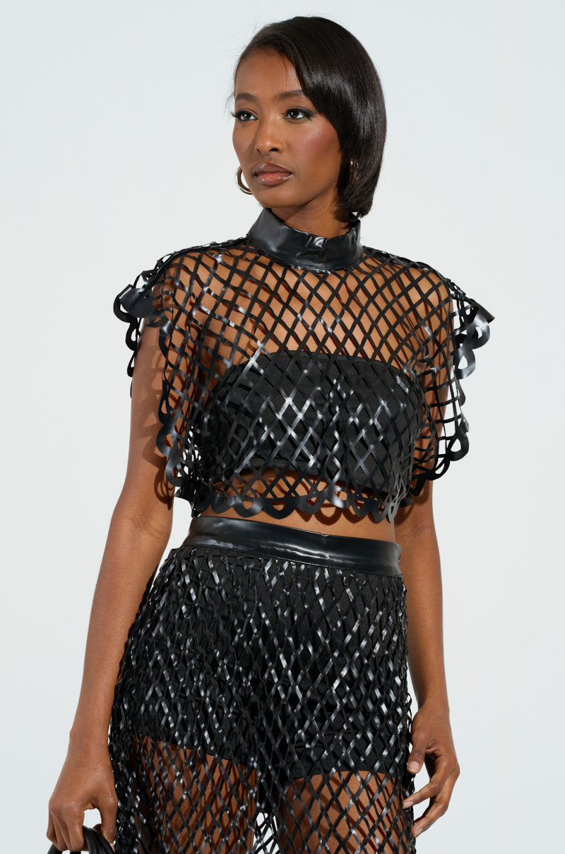 Untamed and fierce in The AWNIS Label Breaking Through Top. This daring style is crafted from an unlined faux leather base and features a geometric cage-like construction. a mock wide leather collar with dual button closures at the nape of the neck. a sleeveless design. exposed sides. and scalloped hems. Includes a stretchy bandeau to layer. Complete with a cropped silhouette. and an easy. pull-on fit. Pair it with the matching AWNIS Label Breaking Through Maxi Skirt. platform moto boots. and a red lip for a finished look.