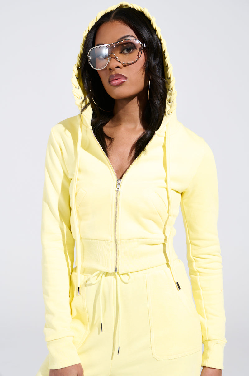 Brighten your day with The AWNIS Label Butterfinger Sweatshirt. Crafted from plush. stretchy cotton. this comfy cutie features a fitted silhouette. an attached hood with adjustable drawstrings that are decoratively laced through the hood's perimeter. long sleeves with ribbed. cinched cuffs. and a ribbed. cinched hem. Complete with welted waist pockets and a metallic zip-front closure. Pair it with the coordinating Butterfinger Wide-Leg Sweatpant for a sunny. monochromatic look.