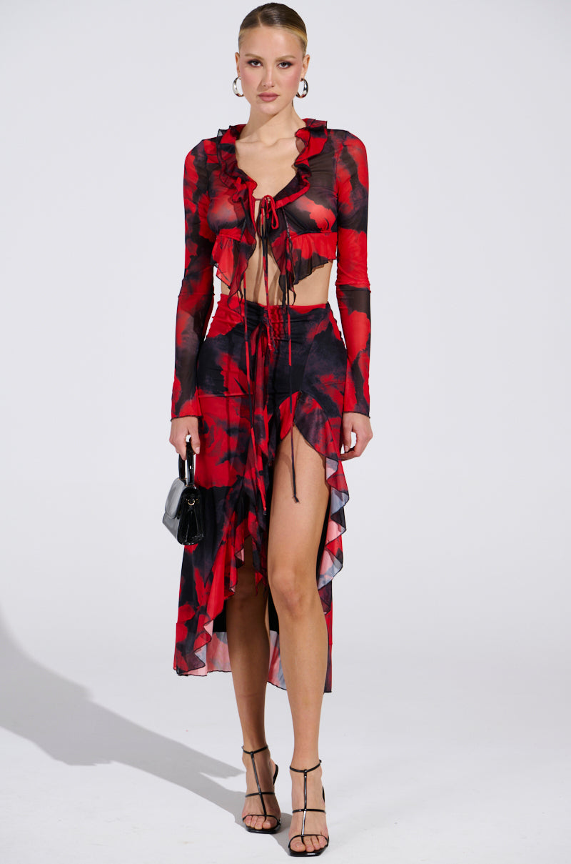 Sweet as can be. with a little bit of heat in The AWNIS Label Carolina Mesh Midi Skirt. This alluring. bold skirt is crafted from double-lined. sheer mesh with an abstract two-tone floral pattern. It features a high-rise fit. an elasticized waistband. flattering ruched detailing on the front and back. a cascading ruffle accent on the waist. and a sexy front slit with coordinating ruffle trim hemlines. Complete with a sleek inner lining. a curve-hugging silhouette. and a midi length. Style it with the complementary AWNIS Label Carolina Long Sleeve Mesh Top. kitten heels. and a smoky eye for a sizzlin' finish.