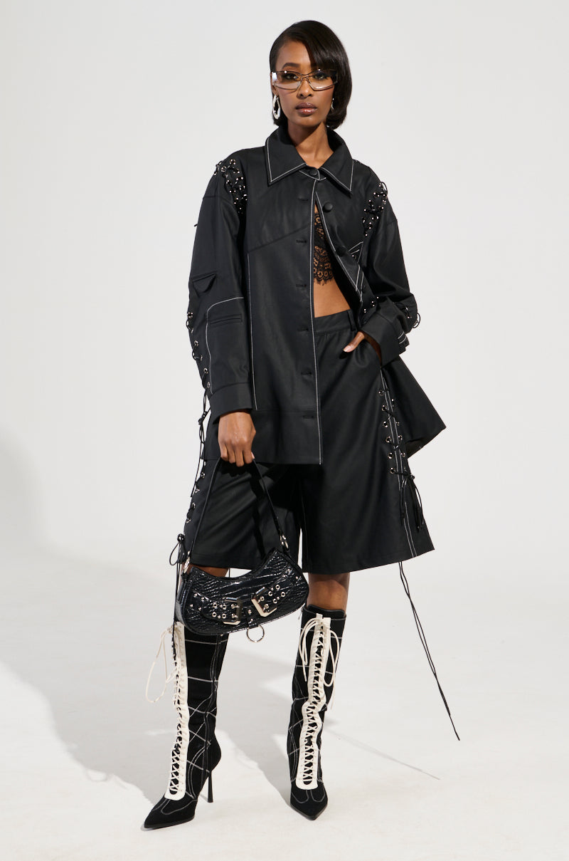 Comin' in hot with The AWNIS Label Cold Heart Short. This cool-girl bottom is crafted from a non-stretch. buttery smooth faux leather base and features a high rise design. functional belt loops. side slant pockets. contrast stitching. and asymmetrical lace-up panels with faux silver metallic grommet hardware on the front. side. and back hems. Complete with a sleek inner lining. a button zip front closure. and a cargo length silhouette. Pair it with the matching AWNIS Label Cold Heart Button Down and combat boots for a finished look.