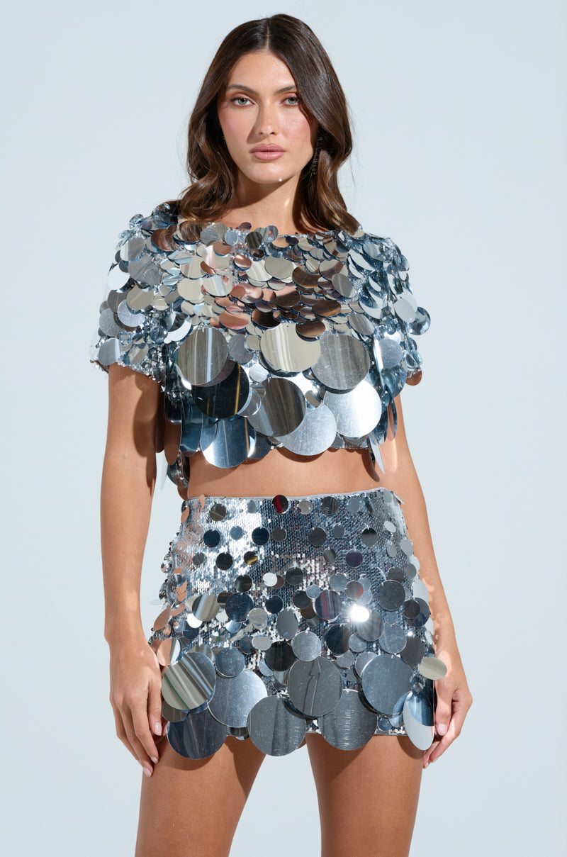 Don't “drop the ball” on your NYE look! The AWNIS Label Countdown to Midnight Top is crafted from a stretchy base fabrication that's covered in layers of scintillating silver sequins. It features a cropped. short-sleeve silhouette. a wide scoop neckline. smooth interior lining. and a metallic zip back closure. Oversized sequin discs adorn the hemline for a mesmerizing. mirrorball-esque finish. Wear it with the coordinating Countdown to Midnight Mini Skirt and silver accessories and hit your holiday party in style.