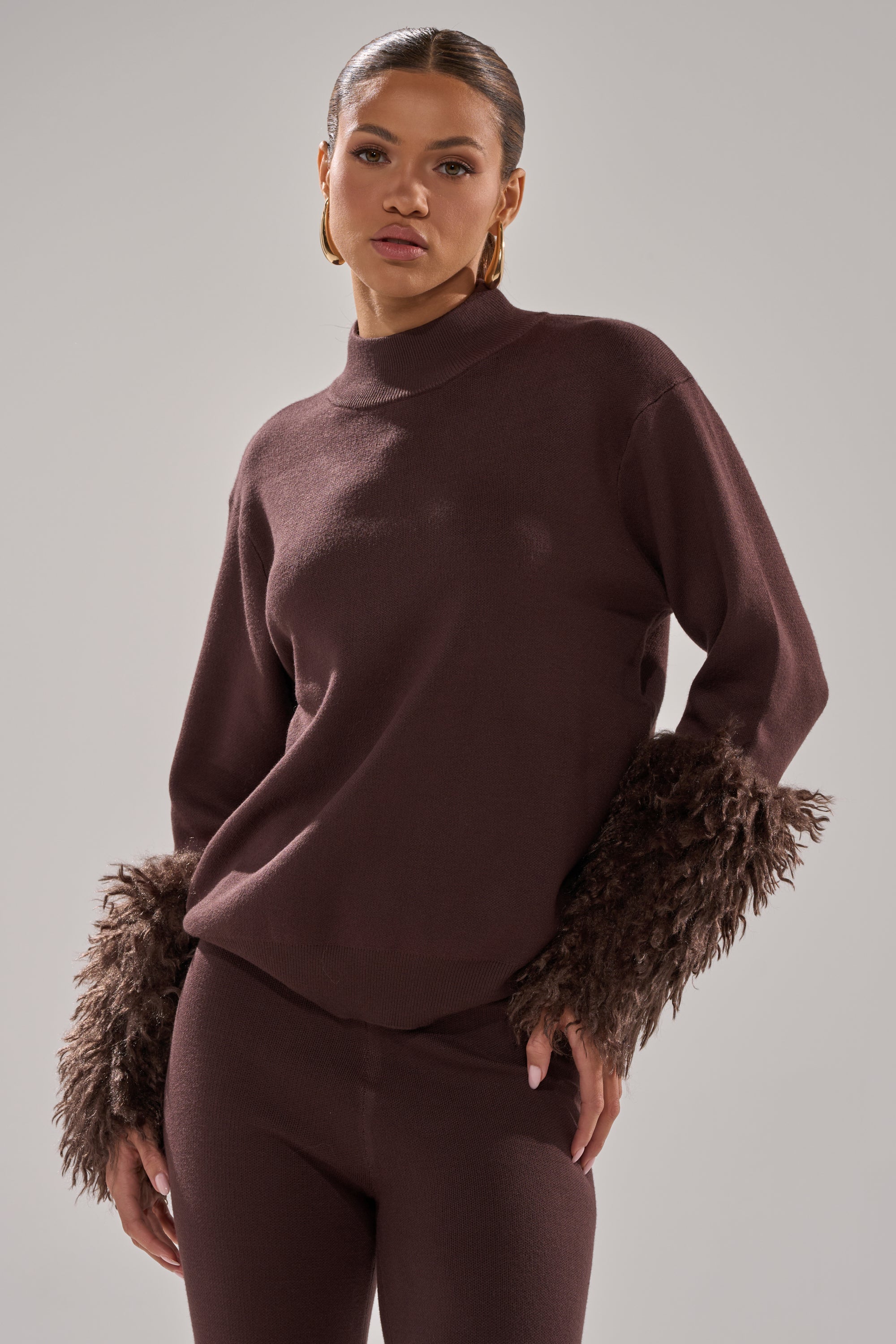 Stay snug all season long in The AKIRA Label Cozy Vibes Sweater With Fur Cuffs. Crafted from a supremely soft. stretchy knit in a rich. chocolate brown hue. this pullover features an oversized. relaxed fit. a ribbed mock neck. and long sleeves with tonal. chicly shaggy faux fur cuffs. Pair with the Cozy Vibes Sweater Pant for a cute. coordinated finish.