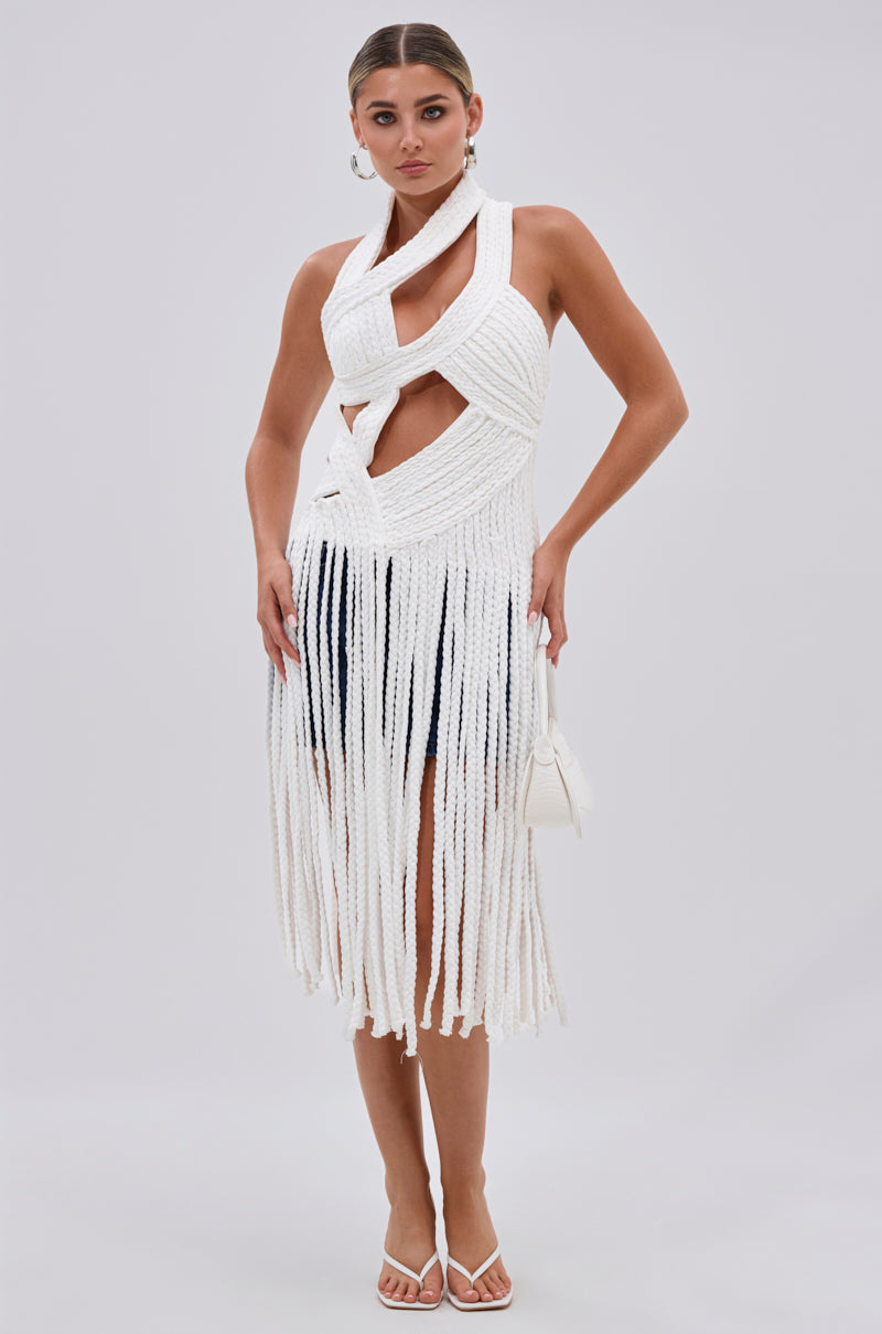 The AWNIS Label Crazy But The Same Rope Blouse is a sculptural. avant-garde piece crafted entirely from intricately braided rope that wraps and drapes across the body. It features a criss-cross halter neckline. a sleeveless design. asymmetrical cut outs on the bodice. and a cascading fringe hem that flows past the knees. Complete with a metallic back zipper closure.