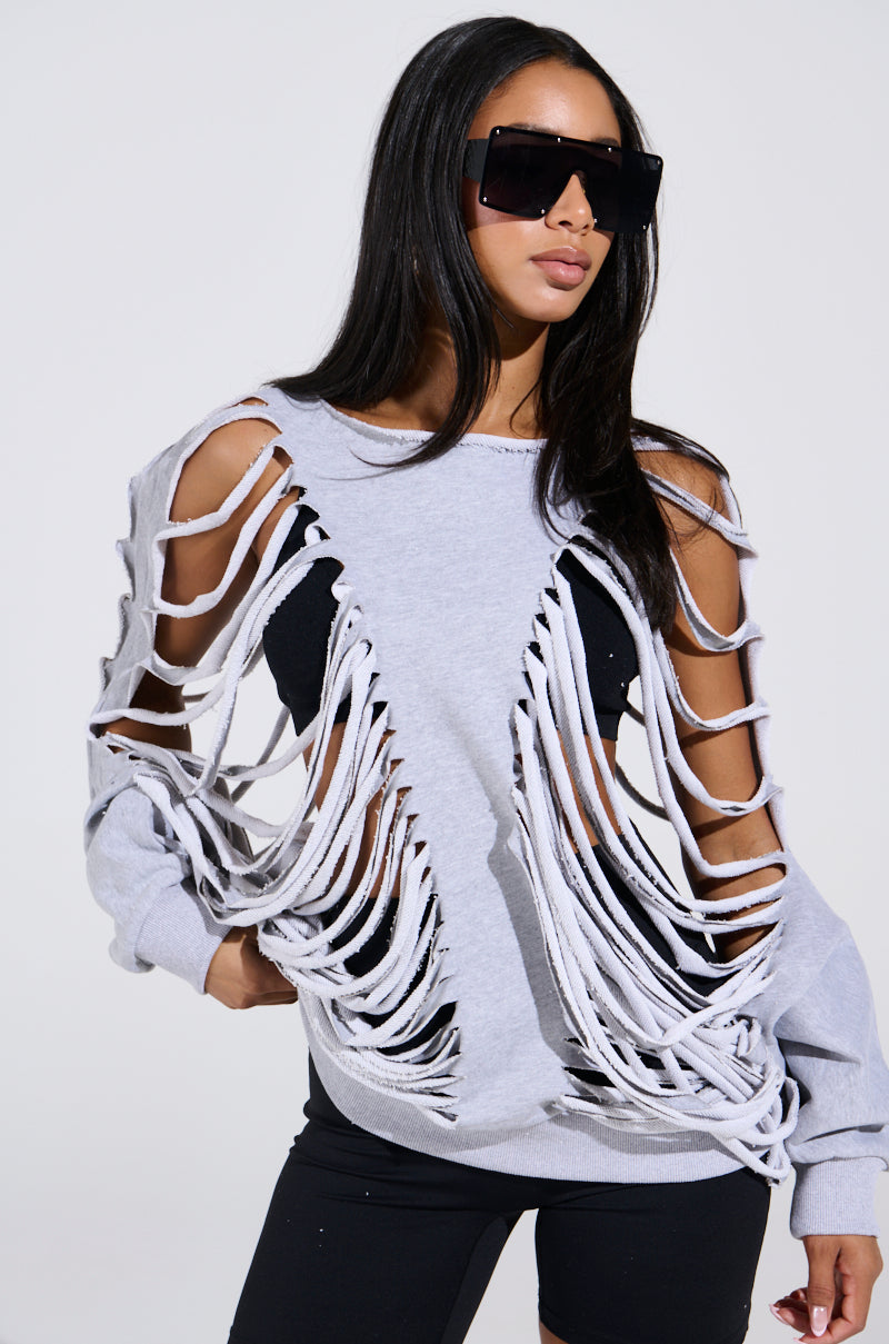 You can do better. diva. Dump him! The AWNIS Label Cut Him Off French Terry Sweatshirt is crafted from a soft cotton-blend and features an oversized silhouette. a scoop neckline. long sleeves with ribbed. cinched cuffs. and heavily distressed. shredded paneling on the front and back. Pair atop a tank with a distressed denim skirt and chunky moto boots for a hot-yet-cold-blooded ensemble.