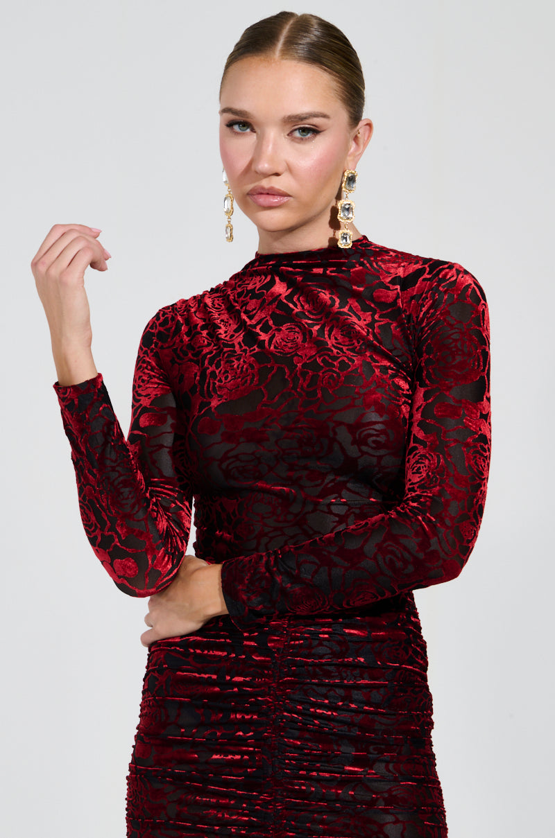 If cute were a crime. you'd be guilty in The AWNIS Label Cute As Can Be Bodysuit. This elegant piece is crafted from a stretchy. semi-sheer mesh base and features a floral pattern throughout made of a sensuous. shimmering velvet fabrication. a mock neck. a sleeveless design. subtle ruching at the top of one shoulder. long sleeves. and a cheeky thong bottom with snap gusset closures. Complete with a curve-hugging fit. and a back zipper closure. Pair with the matching AWNIS Label Cute As Can Be Maxi Skirt. strappy stilettos. and a vampy lip for a finished look.