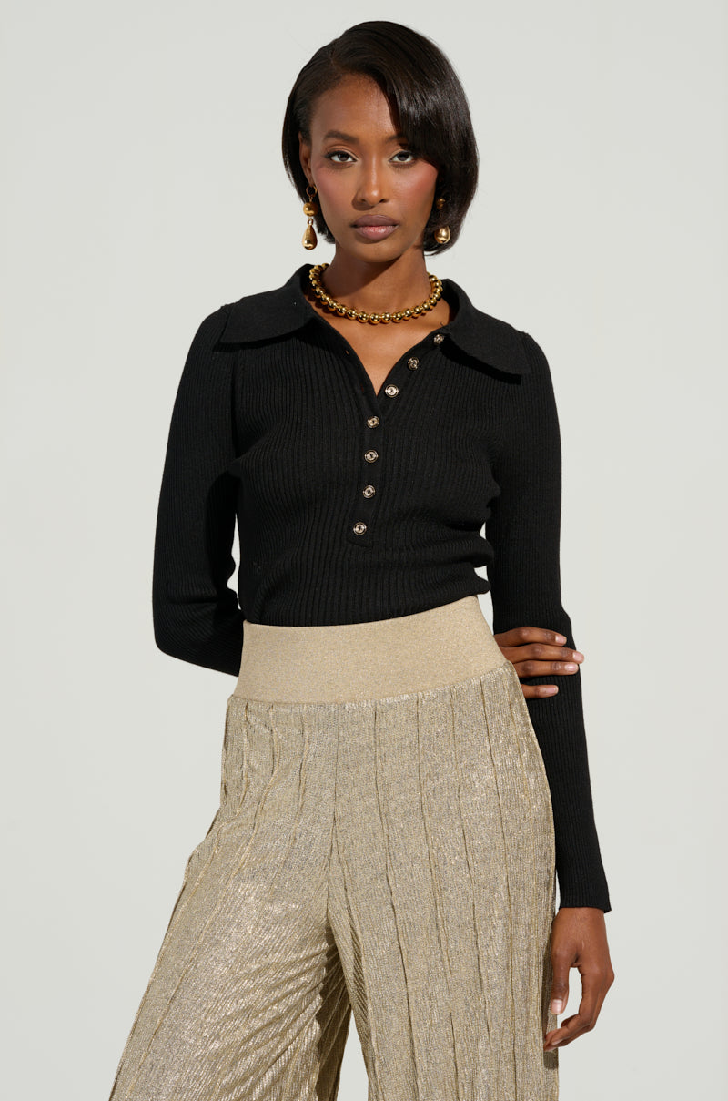 Don't mind me. casually slaying in The AKIRA Label Don't Mind Me Sweater In Black. This super soft and stretchy top is crafted from a ribbed knit fabrication and features a cropped. form-fitting silhouette. long sleeves. a pointed fold-over collar. and a button down front placket with black and gold buttons. Style it with a blazer. high-rise jeans. and loafers for a finished look.