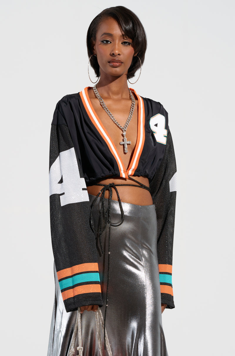 It's impossible to be a background character when you wear The AWNIS Label Fading Top. This sporty-chic top is crafted from a stretchy. sleek jersey fabrication and features a cross-front plunging v-neckline with contrast striped detailing. and tonal long sleeves made of a mesh jersey-like fabrication that boasts color block striped accents on the bottom hems and contrast graphic “4” on the upper shoulders. This Game Day-ready top also comes with a contrast embroidered letterman “4” patch on one side of the chest. a graphic “46” on the back panel. and an elasticated bottom hem with a wrap-around. rhinestone embellished self-tie closure. Complete with an ultra cropped silhouette. Pair with baggy cargo pants and chunky sneakers for a finished look.