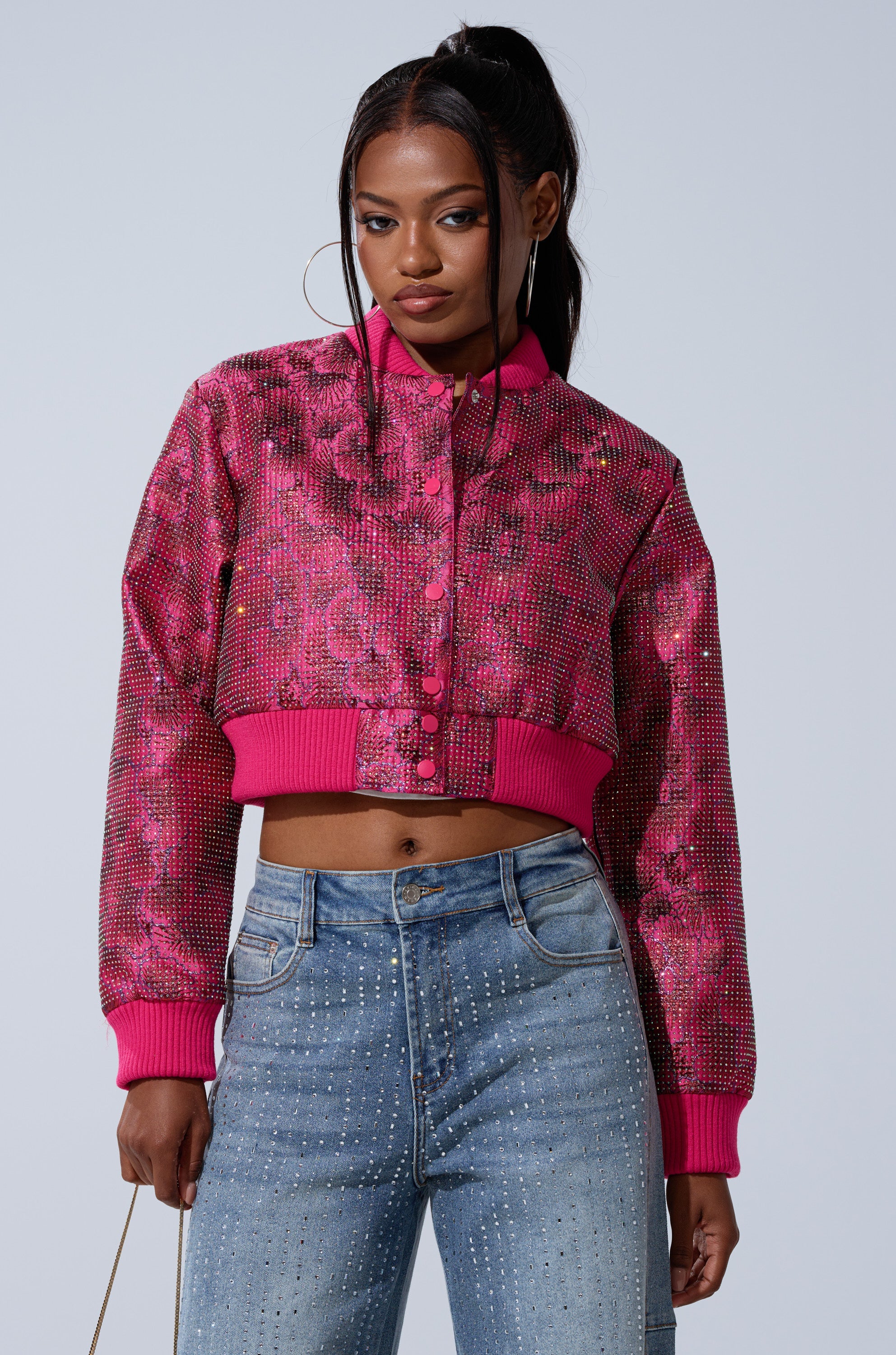Glam up your outerwear game with The AWNIS Label Fleur Rhinestone Brocade Bomber. Crafted from a shimmering metallic fabrication. this bedazzled jacket features a contrast floral brocade pattern throughout. tonal ribbed knit hemlines. a standing collar. long sleeves with cinched cuffs. a coordinating bottom hem. matte snap button front closures. and adorned in its entirety with iridescent rhinestone embellishments. Complete with a sleek inner lining. and a boxy. cropped silhouette. Style with boyfriend jeans. stiletto booties. and metallic accessories for a standout finish.