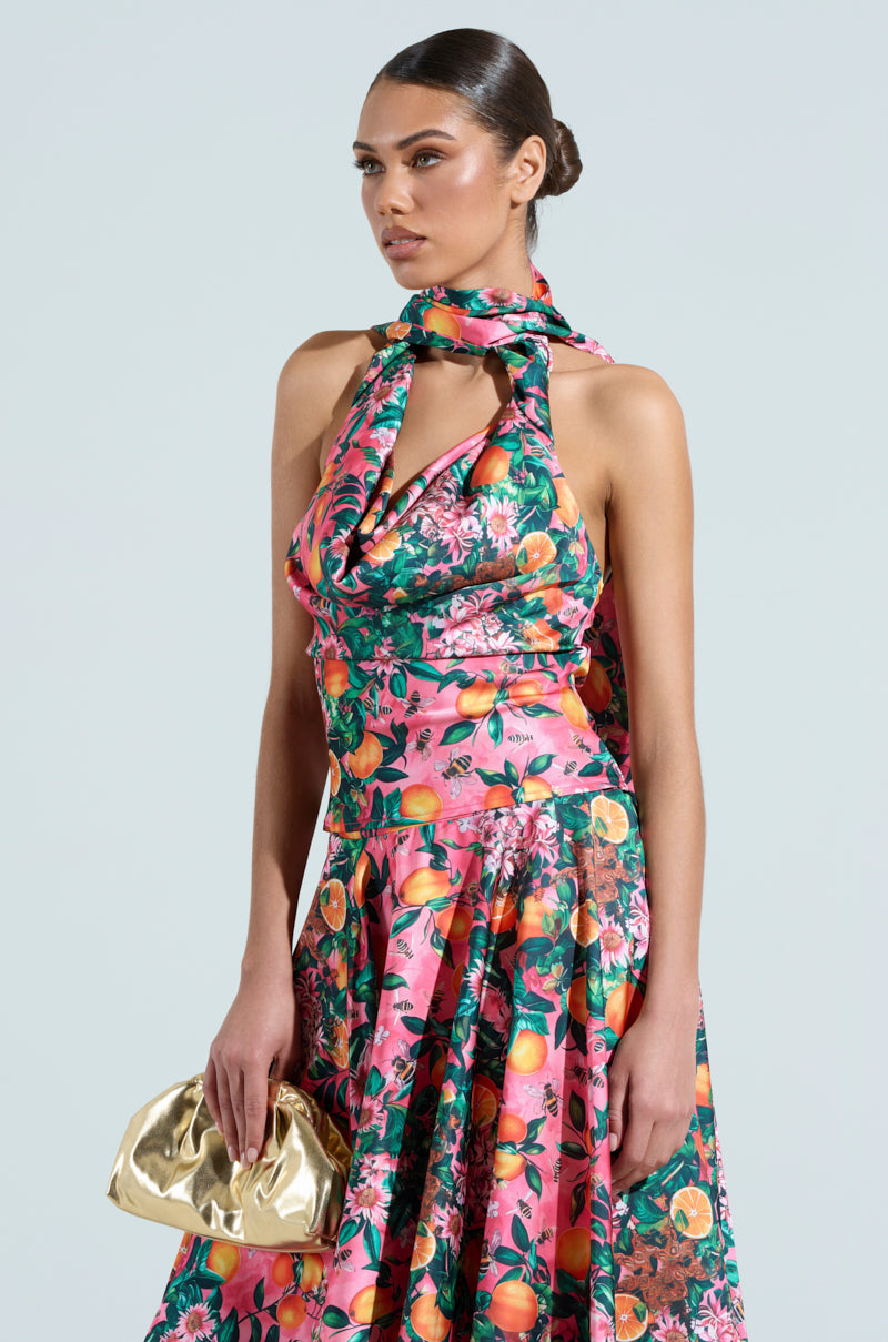 Can you bee-lieve how cute this top is!? The AKIRA Label Fresh As Can Be Blouse is a vibrant. spring-ready style crafted from a silky. non-stretch satin fabrication. It boasts a cropped. sleeveless silhouette. a slinky cowl neckline. an attached halter neck with extended. scarf-like attachments. slick interior lining. and a metallic zip-back closure. A lush gardenscape pattern featuring flowers. oranges. and honeybees adorns this beauty for a lively finish. Style it with the coordinating Fresh As Can Be Midi Skirt for a sweet. seamless look.
