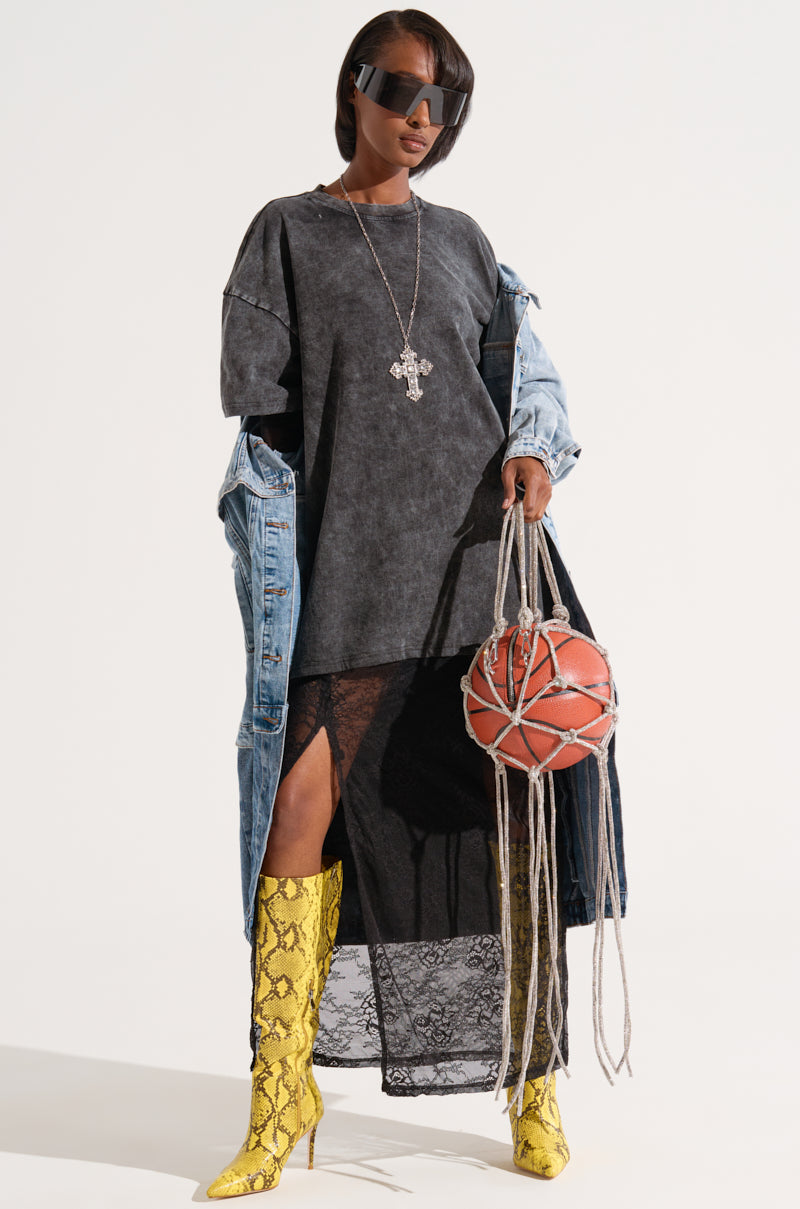 Edgy tomboy meets frilly femininity in The AKIRA Label Girly But Not Layered Lace Midi Dress. This pull-on dress is crafted from soft. semi-stretchy cotton and features an oversized. mineral wash t-shirt base with short sleeves and a crew neckline. It's complete with long. lace sleeve attachments and an attached. midi-length lace skirt with a knee-high. right-leg slit. Wear it with chunky combat boots and layers of silver jewelry for a finished look.