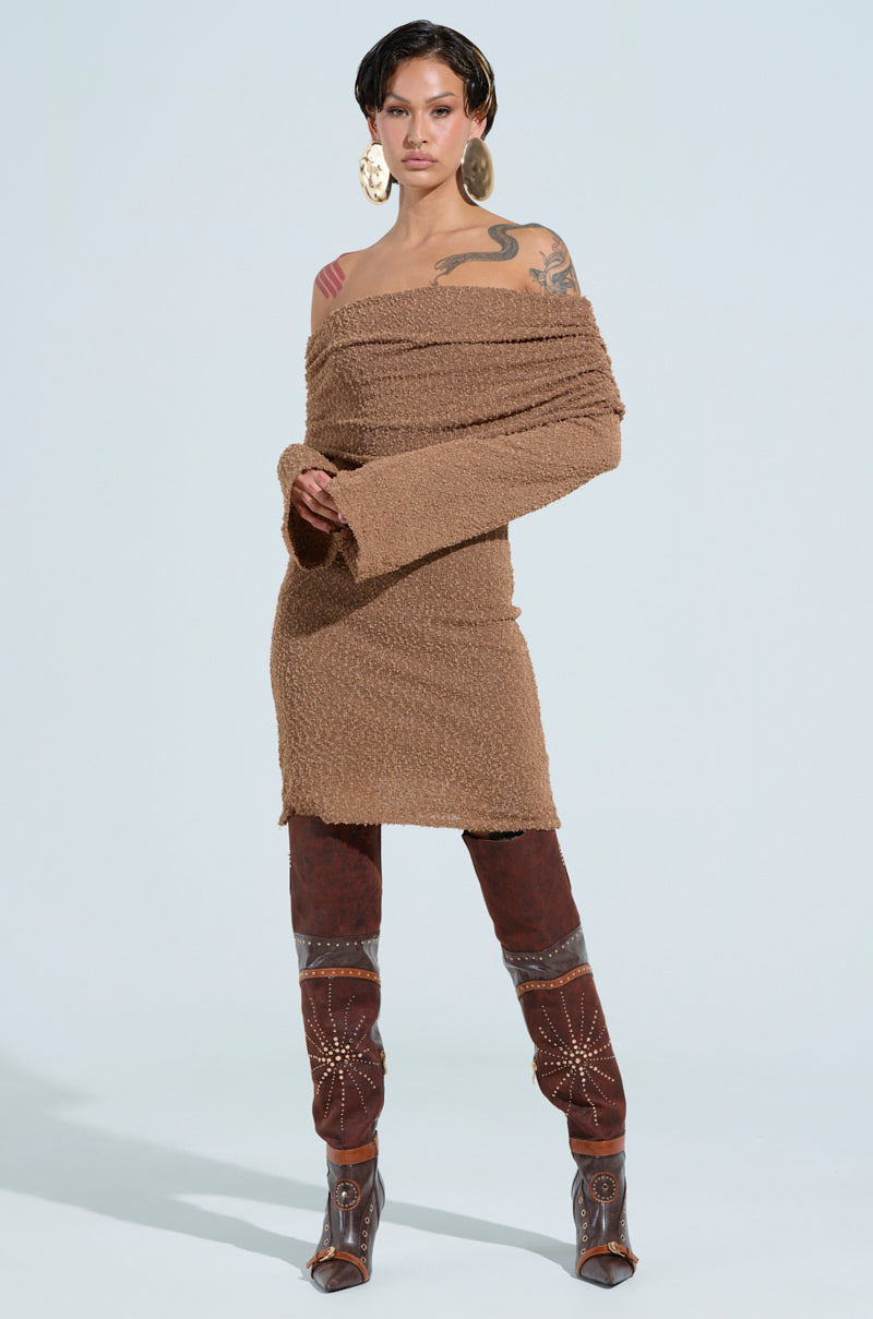 This might be fate… and your sign to buy The AKIRA Label Give Me A Reason Mini Dress. This cozy-sweet piece is crafted from a textured. double-lined knit base and features an elasticized off-the-shoulder fold over neckline. long flared sleeves. a subtly flared skirt. and a satiny inner lining. Complete with a skater dress silhouette. a mini length. and an easy. pull-on fit. Pair with knee-high leather stiletto boots. a red lip. and a shoulder bag for a finished look.