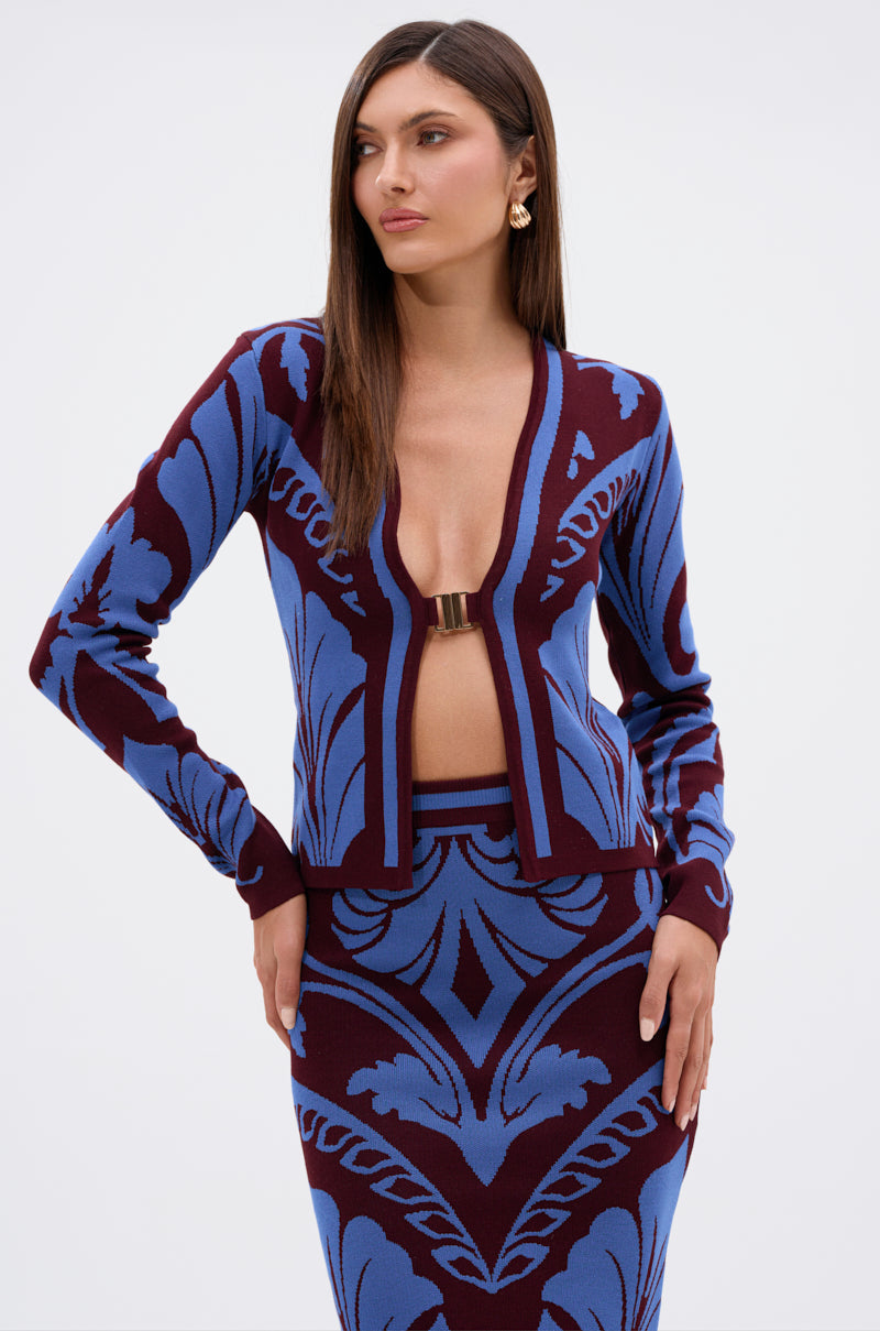 Make a lasting impression with The AKIRA Label Give Me Love Sweater. designed in a rich burgundy hue with bold cobalt blue detailing. Made from a cozy. stretch-knit fabric. it features long sleeves. an open front. and a sleek gold-tone clasp that cinches the waist for a tailored. elegant silhouette. The ornate damask pattern adds a luxurious edge. making it perfect for layering over fitted dresses or pairing with the coordinating Give Me Love Midi Skirt.