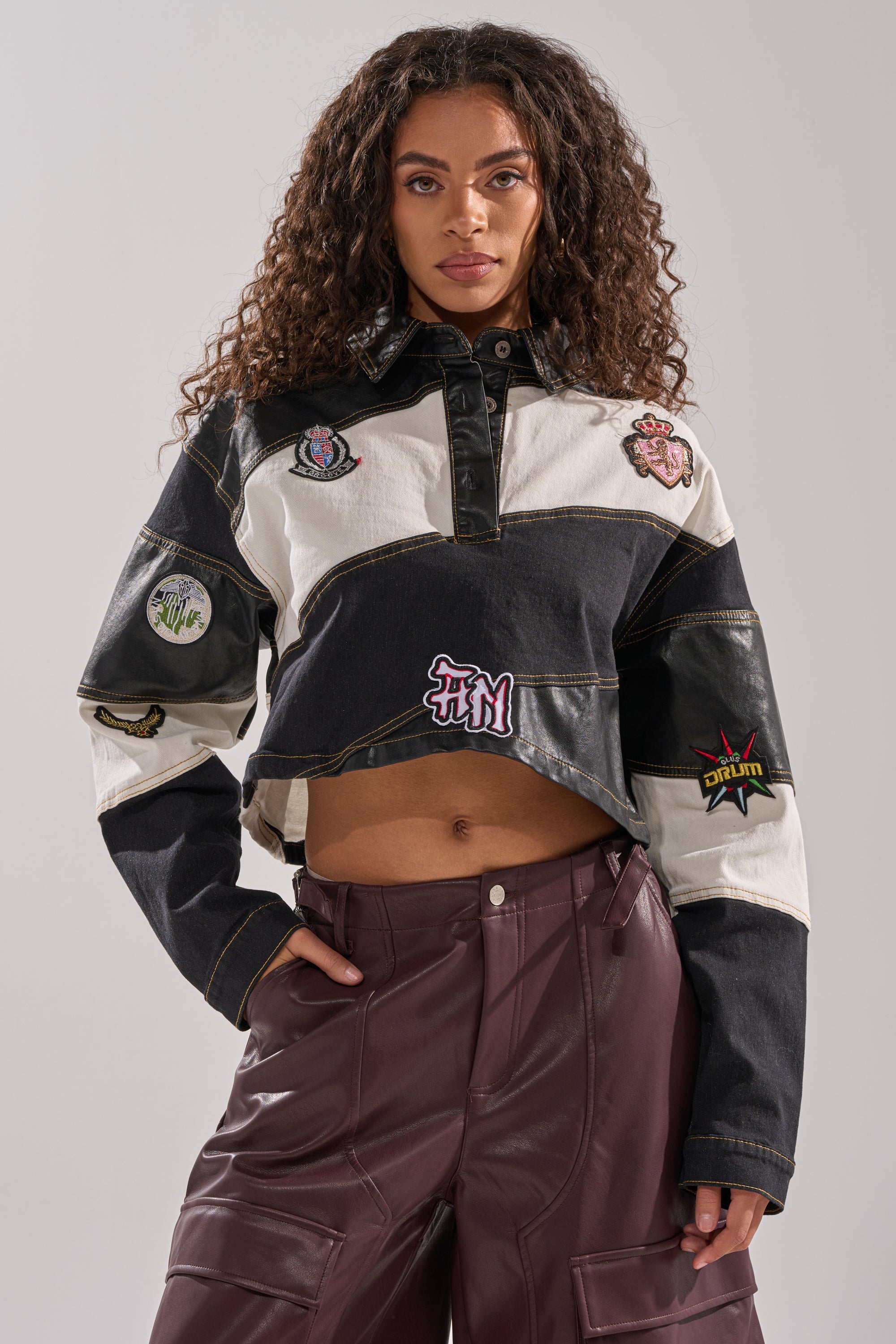 Guess what… you look amazing in The AKIRA Label Guess What Stripe Collared Blouse. This preppy crop top is designed with wide navy. white. and dark-wash denim panels. with faux leather accents along the collar. placket. and seams. It features a pointed collar. long sleeves with button cuffs. and varsity-inspired embroidered patches throughout. Complete with a boxy. pull-on fit. Pair effortlessly with denim or cargos for a sporty-spice finish.