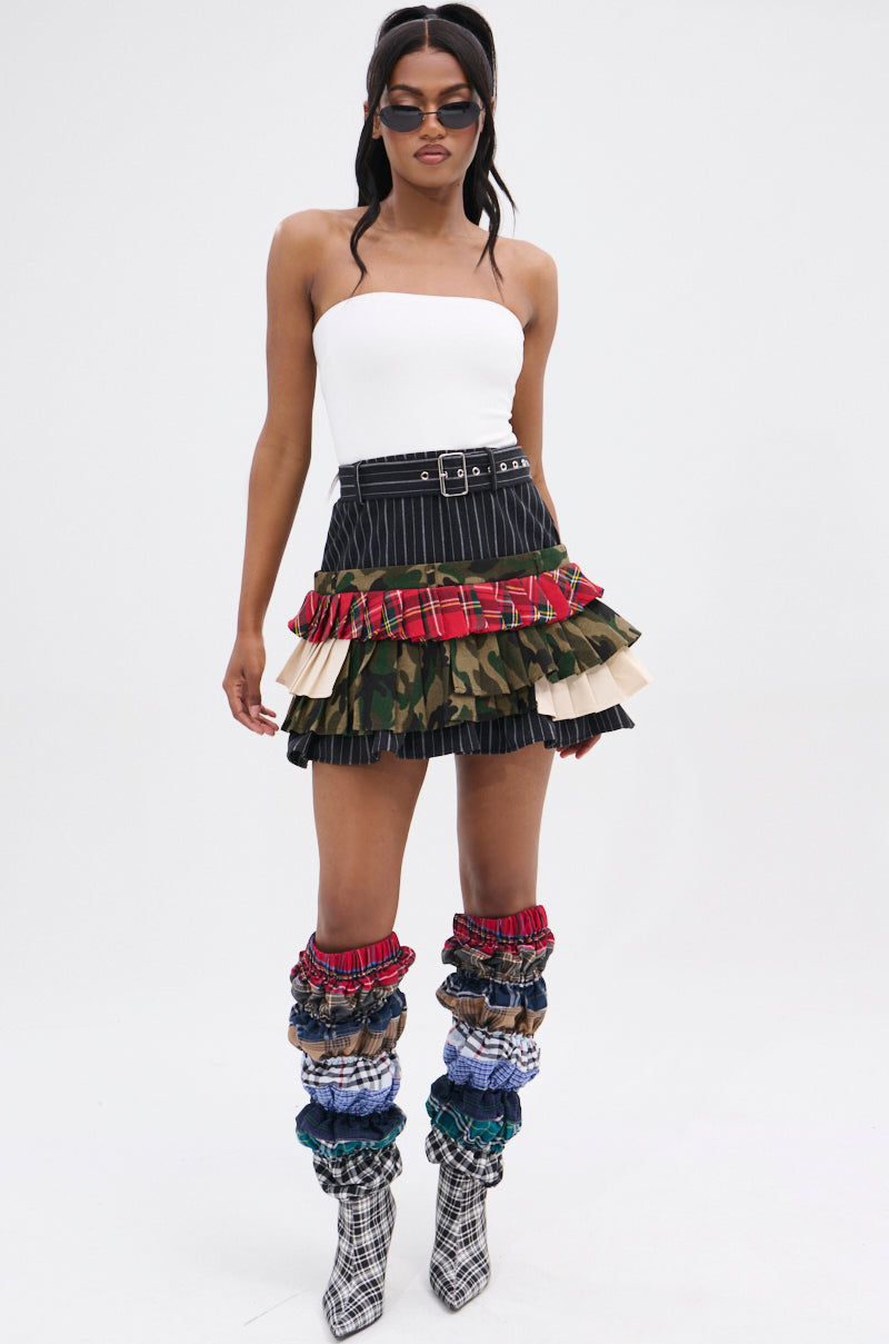 Everyone will be obsessed with you in The AKIRA Label I Heart Me Textured Mini Dress. This preppy head-turner features a strapless neckline with inner elastic trim. a cinched bodice made from a soft and stretchy material. and a self-tie strap across the shoulder blades with a lower back cut out. The body of the dress contrasts dramatically with a high-waisted. built-in layered flared mini skirt that boasts a layered. pleated construction with pinstripe suiting fabric. plaid. camo print. and off-white panels. It also comes with an adjustable buckled waist belt. a sleek inner lining. and a lower metallic back zipper closure. Complete with a mini length. and a flirty skater silhouette. Style with platform pumps. a statement necklace. and a clutch for a finished look.