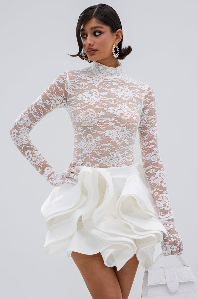 Hollywood called. they want their star back. The AWNIS Label I'm A Star Lace Glove Bodysuit is crafted from a curve-hugging. floral lace fabrication and features a mock neck. nude lining on the bodice. sheer long sleeves with attached gloves. and a cheeky thong bottom with snap gusset closures. Style it with the matching AWNIS Label I'm A Star Lace Bow Top. a satin midi skirt. and stiletto pumps to steal the spotlight every time.