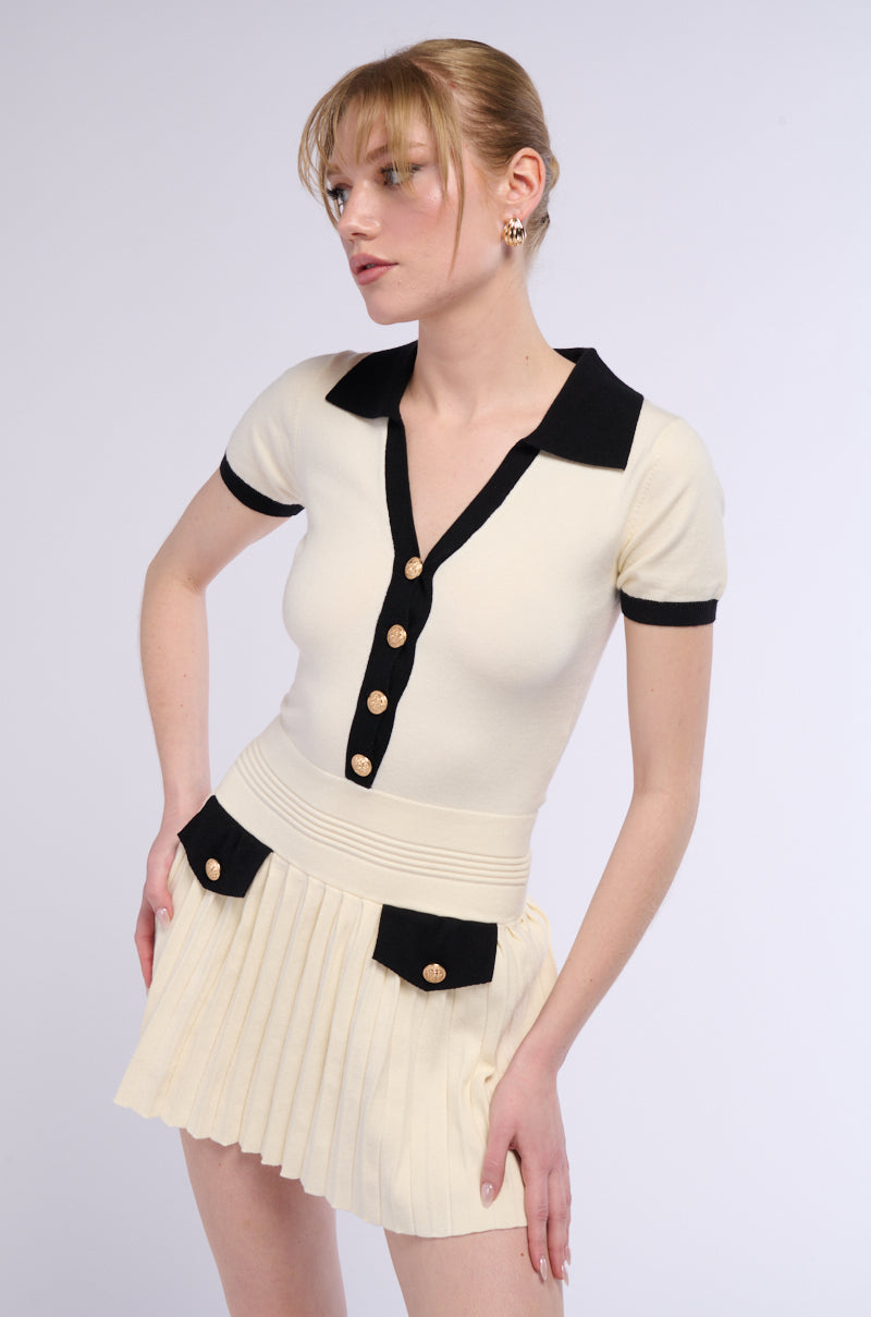 Elegant. effortless. chic. The AKIRA Label Sofia Era Knit Mini Dress is a soft stretch knit piece featuring a pointed polo collar. a button front v-neckline. short sleeves. a pleated fit and flare skirt. and a mini length silhouette. Complete with faux flap-front pockets. contrast trim detailing. a drop waist design. metallic faux gold buttons. and a pull-on fit. Style with knee-high boots and a sleek shoulder bag for a finished look.