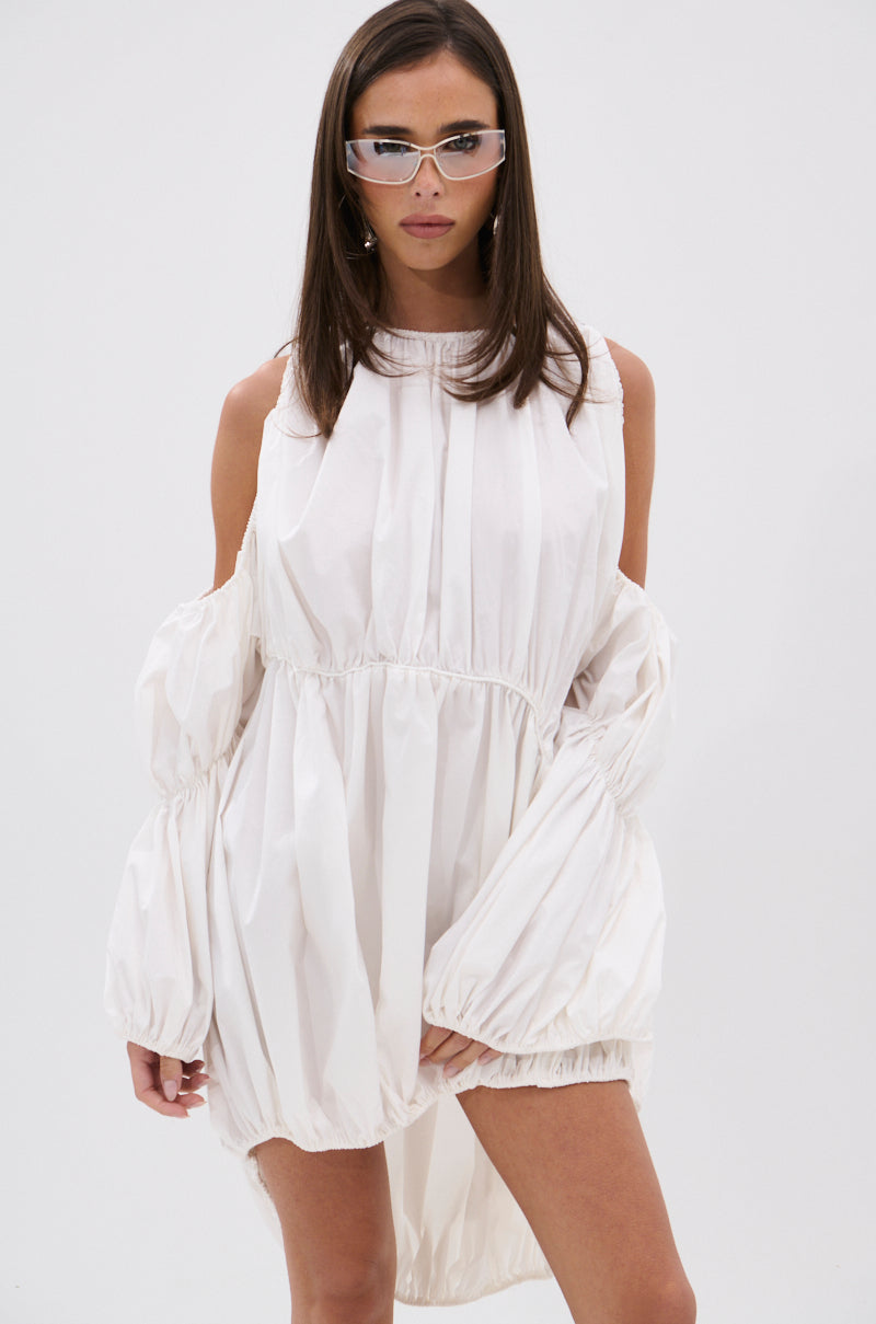 Have a selfie-worthy moment in The AKIRA Label Insta Saw It First Adjustable Mini Dress. This casually chic piece is crafted from a crisp. lightweight cotton-blend and features a voluminous high-low design. a thin elastic waistband. a boat neckline. poofy long sleeves with upper arm cut-outs. an asymmetrical left oblique cut-out. ruched detailing throughout. and a pull-on fit. Complete with toggled bungee cords at the shoulders. sleeves. and hem. this adjustable piece gives you the power to customize your silhouette. Style with minimalist mules and a wicker handbag for an airy. summer-ready ensemble.