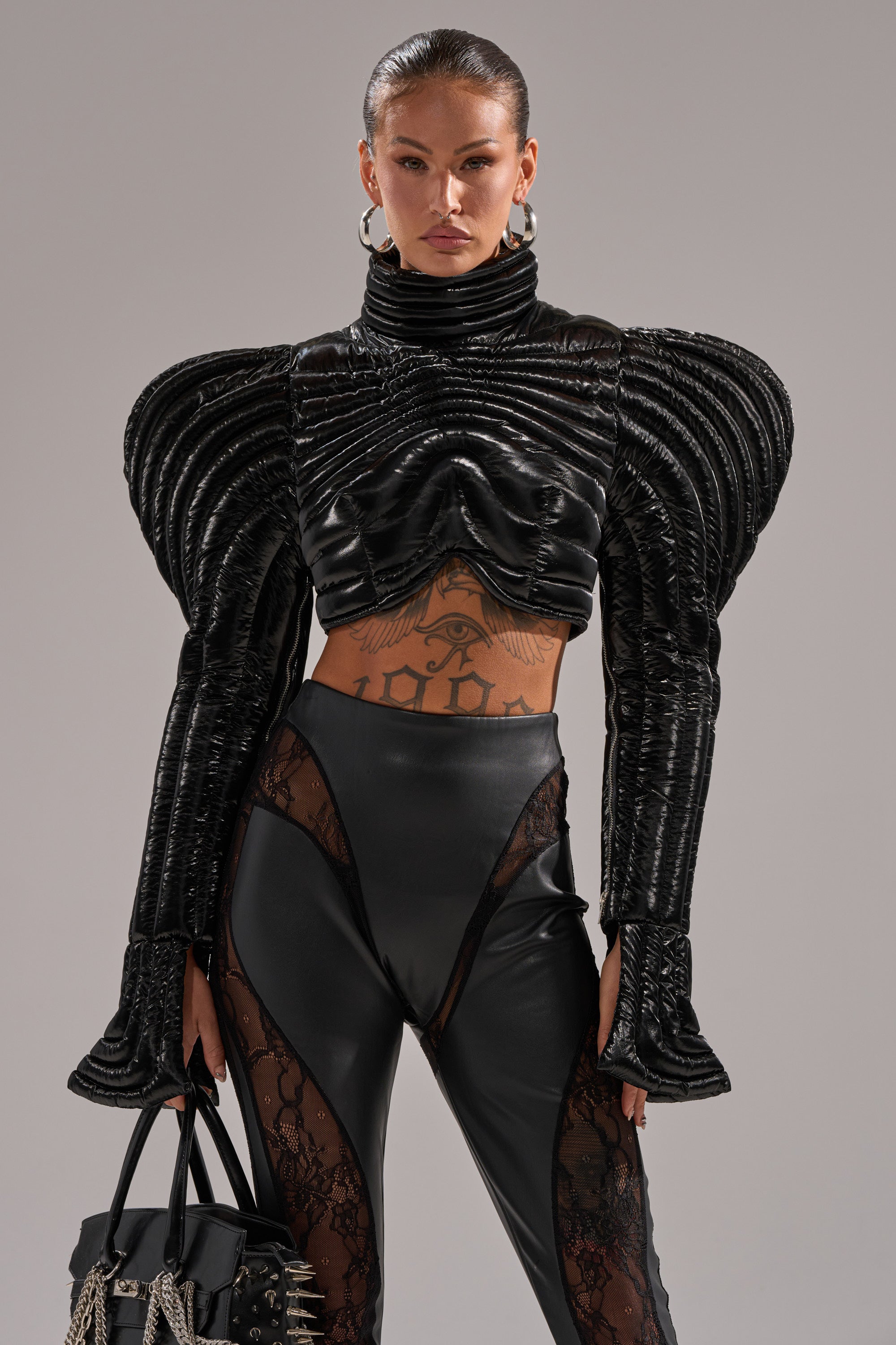 Take on the world in The AWNIS Label Keep It Coming Top. This outta-the-box piece is crafted from a sleek. paneled puffer base and features a standing collar with metallic snap button closures at the nape of the neck. structured shoulders that delivers a dramatic. angular silhouette. long sleeves with flared cuffs and functional metallic zipper detailing on the underarms. a curved front hem. and a tonal lace-up panel on the back. Complete with an ultra-cropped fit. Pair with flared leather pants and stiletto booties for a futuristic finish.