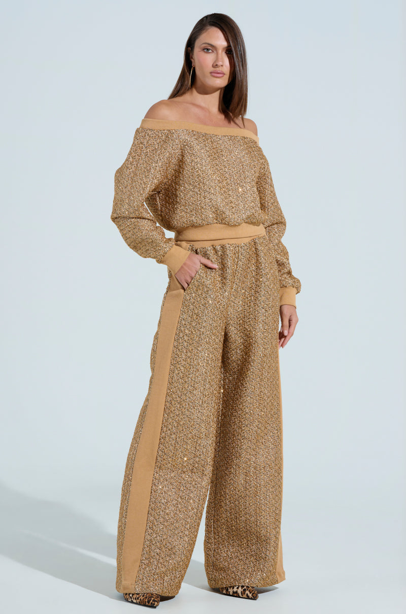 Don't let the haters get you down… The AWNIS Label Keep Moving Pant is a cozy. casual style crafted from a tweed fabrication interwoven with shimmering metallic gold thread and tonal sequins. These pretty pants feature a high-rise. wide-leg silhouette. an elasticized. ribbed knit waistband. coordinating ribbed knit side seams. and spacious waist pockets. Complete with smooth inner lining and a simple pull-on fit. Pair them with the complementary Keep Moving Off The Shoulder Top for a complete look.