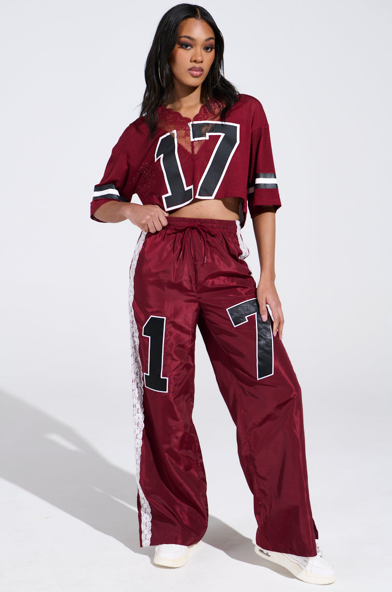 Score major style points in The AWNIS Label Let's Get It Track Pant! Crafted from a swishy windbreaker fabrication. these 90's-inspired sweats feature a high-rise. relaxed fit. an elasticized waistband with adjustable drawstrings. lace side-seam trim that runs from waist to hem. and spacious side-seam pockets. Complete with ankle-high slits on the outer pantlegs. an embroidered “17” on the front thighs. and an embroidered “1990” patch on the rear. Wear them with the Let's Get It Jersey for a cool. coordinated game-day look.