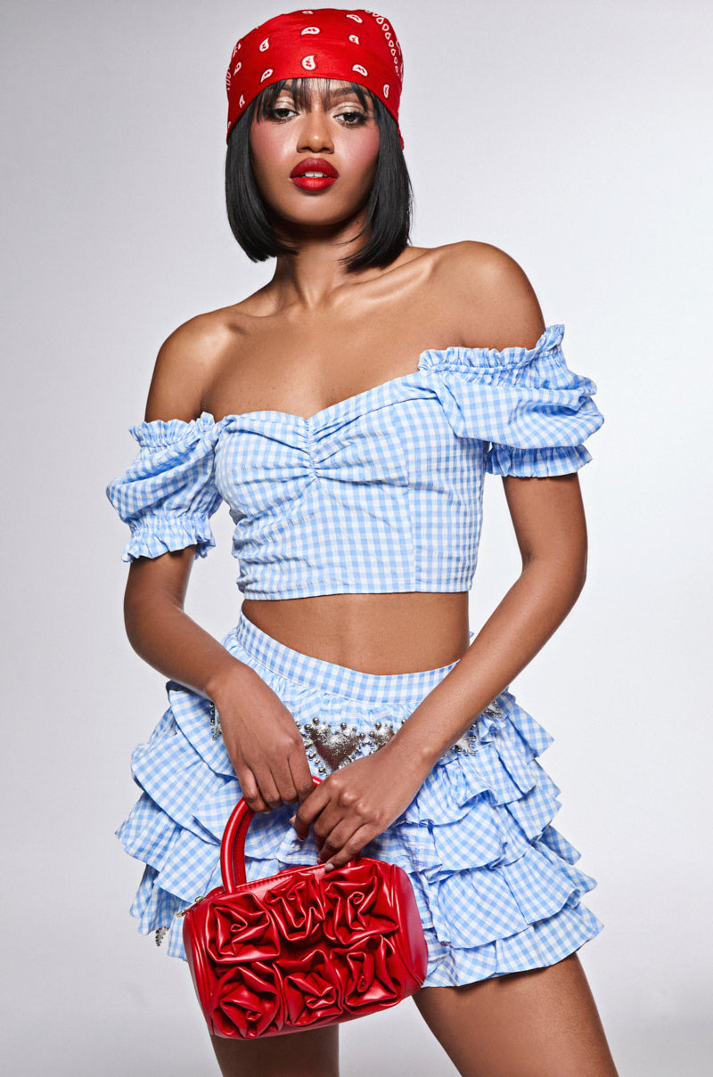 Dorothy's signature look just got a facelift. The AKIRA Label More Fun For Me Blouse is crafted from a lightweight fabrication adorned with an adorable blue gingham pattern. It features a cropped. fitted silhouette. a sweetheart neckline with ruched detailing. and short puff sleeves with romantic ruffle trim. Complete with smooth interior lining and a tonal back zipper closure. Style it with the More Fun For Me Ruffle Skirt for a cutesy. coordinated look!