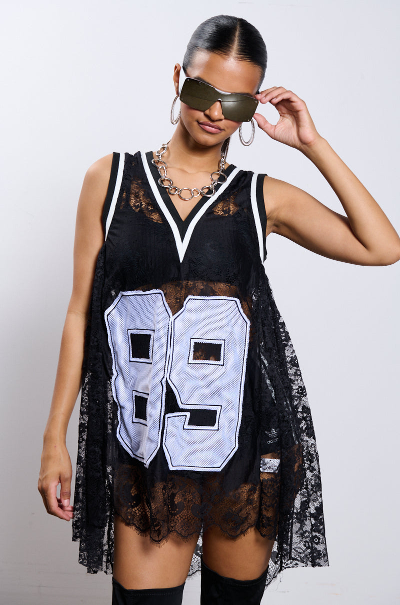 Sit pretty courtside in the The AKIRA Label On The Sidelines Lace Jersey Mini Dress. This sheer lace dress features an oversized mini length silhouette. a plunging neckline. and a scalloped hem. Complete with sporty ribbed knit stripe trim. oversized mesh “89” graphic detailing. and a pull-on fit. Style with a long sleeve turtleneck top and faux leather shorts for a finished look. Shown undergarments not included.