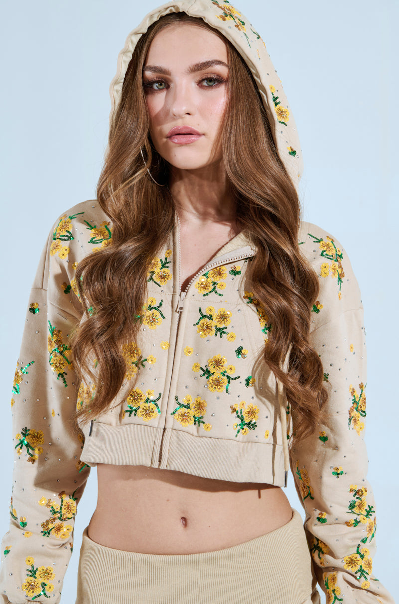 Can never get enough of The AKIRA Label One Too Many Times Zip Up Sweatshirt. This adorable piece is crafted from a cozy cotton blend knit base and features an attached hood with drawstring closures. long sleeves with ribbed knit cuffs. a coordinating elasticized ribbed bottom hem. spacious side slant pockets. and adorned with a sweet floral design made of sequin accents and rhinestone embellishments scattered throughout. Complete with a tonal zip up front closure. and a cropped silhouette. Style it with the matching AKIRA Label One Too Many Times Ruffle Mini Skirt and platform boots for a finished look.