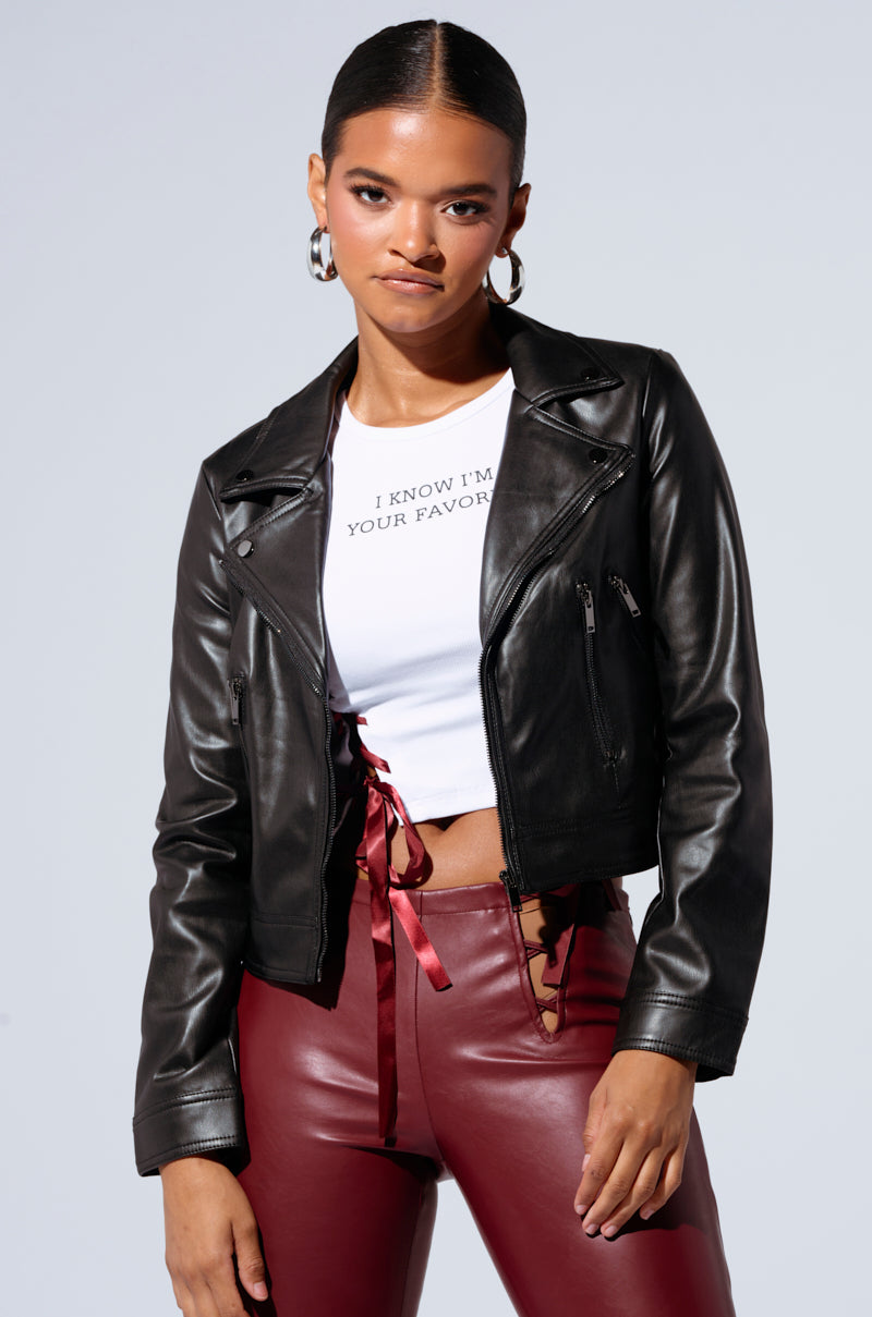 Ready to roll in The AWNIS Label Out The Door Moto. This timeless outerwear piece is crafted from a sleek non-stretch faux leather base and features a studded notch lapel collar. long sleeves with snap button cuffs. tonal stitching. faux hematite hardware. dual functional side slant zipper pockets. and two mock zipper pockets. Complete with a sleek inner lining. a front zipper closure. and a cropped silhouette. Style with wide leg jeans and sneakers for an effortless look.