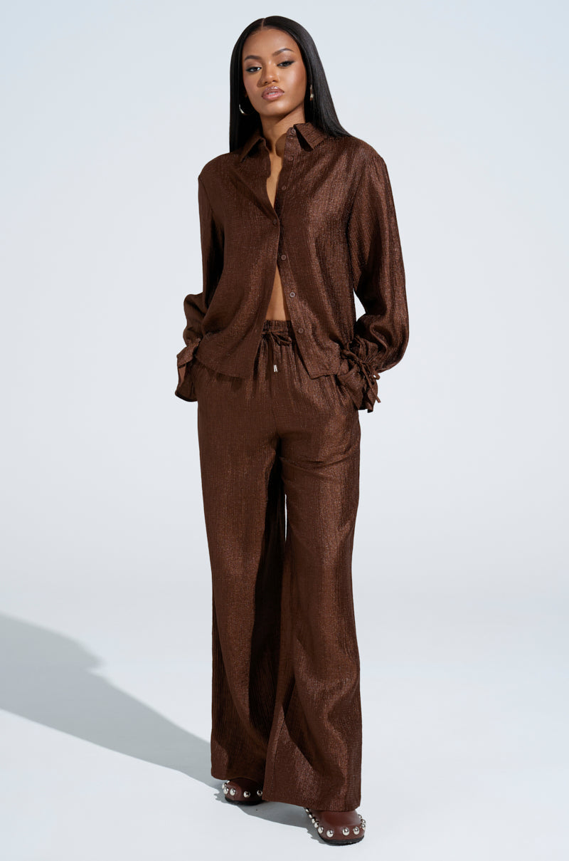The AWNIS Label Palermo Palazzo Pant is crafted from a non-stretch. lightweight fabric with a slight sheen and features a high-rise fit. a shirred elastic waistband with drawstring closures. on-seam side pockets. and subtle texture throughout. Complete with a straight leg silhouette. and an easy pull-on fit. Try styling with the coordinating AWNIS Label Palermo Button Down Top. kitten heels. and a leather clutch for a finished look.