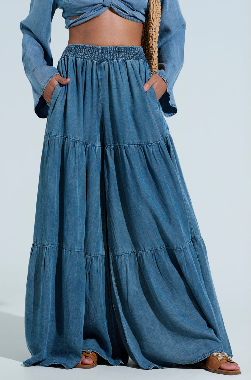 Tens. tens. tens across the board! The AWNIS Label Perfect As Can Be Pant is crafted from a lightweight. denim-inspired fabrication and features a high-rise. ultra-wide-leg silhouette. an elasticized. seersucker waistband. spacious side seam pockets. a segmented design with pleated detailing. and a subtle mineral wash throughout. Pair with the coordinating Perfect As Can Be Tie Front Blouse for a breezy. free-spirited ensemble.