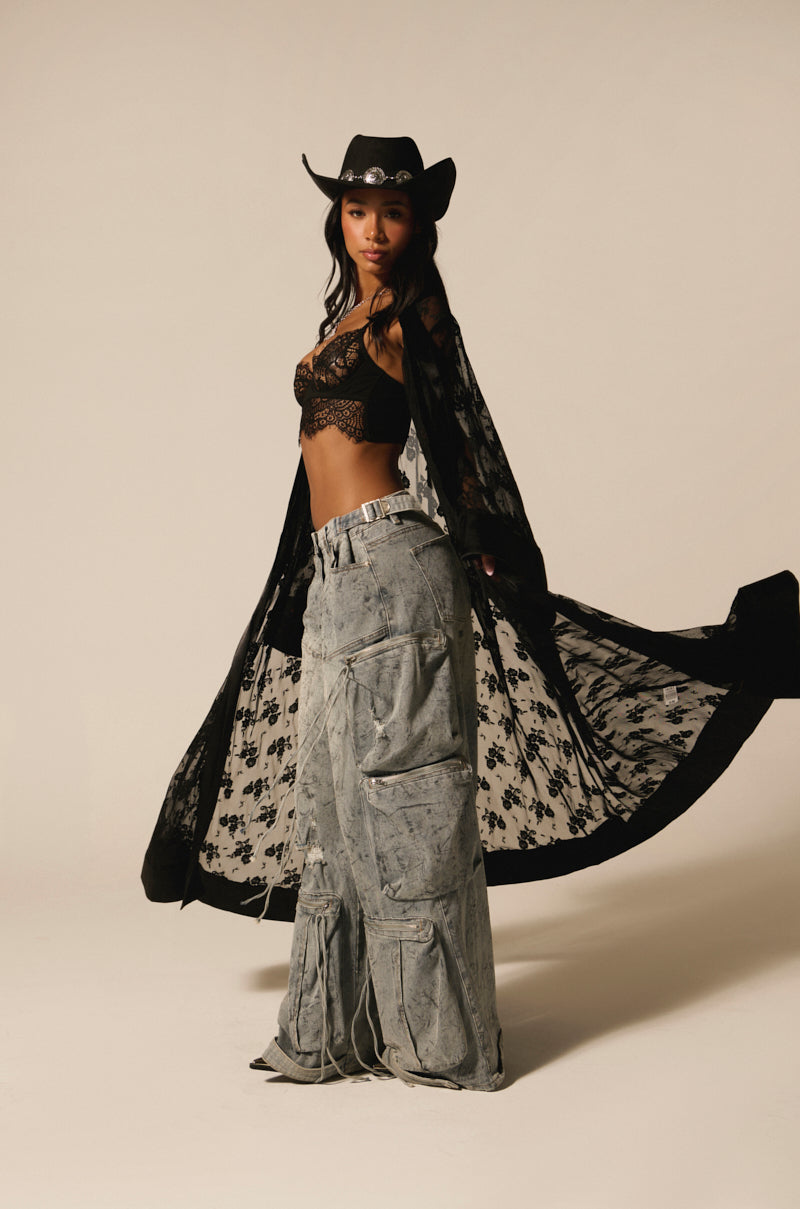 The grind never stops in The AWNIS Label Places To Be Relaxed Cargo Denim Jeans. These effortlessly cool bottoms are crafted from a cotton blend medium wash denim base and features a subtle worn colorway. a mid rise design. functional belt loops with strappy buckle accents on each side of the top hem. a classic five-pocket design with additional zippered cargo pockets with tassel accents lining each pant leg. strappy accents on the bottom pant legs. and distressed ripped detailing scattered throughout. Complete with a faux silver metallic button zip front closure. and a baggy. relaxed silhouette. Pair with a cropped sweater and patent leather loafers for a finished look.