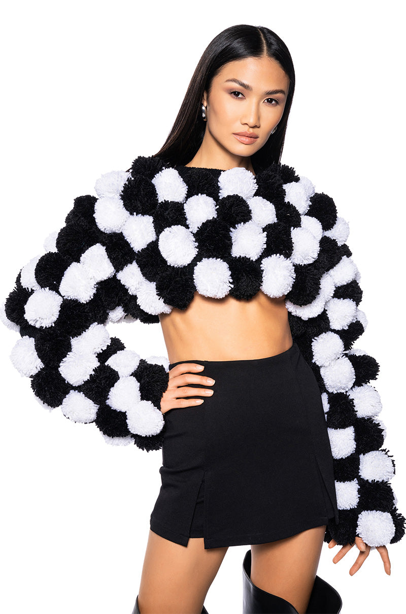 Rooting for cuteness. Inspire cheer-y vibes with The AKIRA Label Pom Pom Cropped Long Sleeve Sweater. This textured piece features a knit base. an ultra-cropped cut. a ribbed knit crew neckline. fluffy knit puffballs throughout. and long sleeves. Pair with a cropped tank. straight leg denim. and ankle booties.