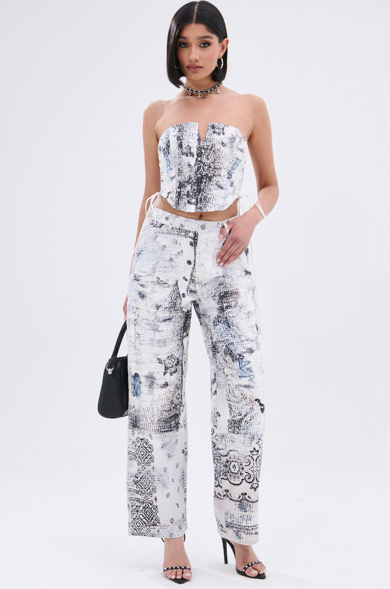 Be loud and proud in The AWNIS Label Read Me Trouser. These bold pants are crafted from lightweight cotton and feature an abstract. linework B&W print. a high-rise fit. functional belt loops. a five-pocket design. a standard button-zip front closure. and a relaxed straight-leg silhouette. Pair it with the matching AWNIS Label Read Me Corset. platform loafers. and a vampy lip for a look that speaks louder than words.