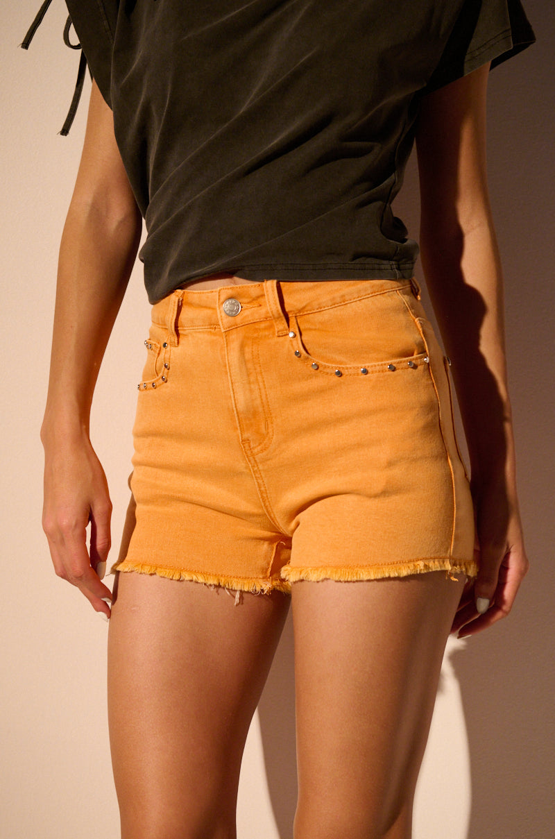 The AWNIS Label Ready To Rock Orange Denim Short is a pair of colored denim bottoms featuring a semi-stretchy cotton blend composition. a high rise waist with functional belt loops. faux silver metallic hardware. a classic five-pocket design. and circular stud embellishments along the front and back. Complete with a mini short silhouette. frayed hem detailing. and a front zip-up buttoned closure.