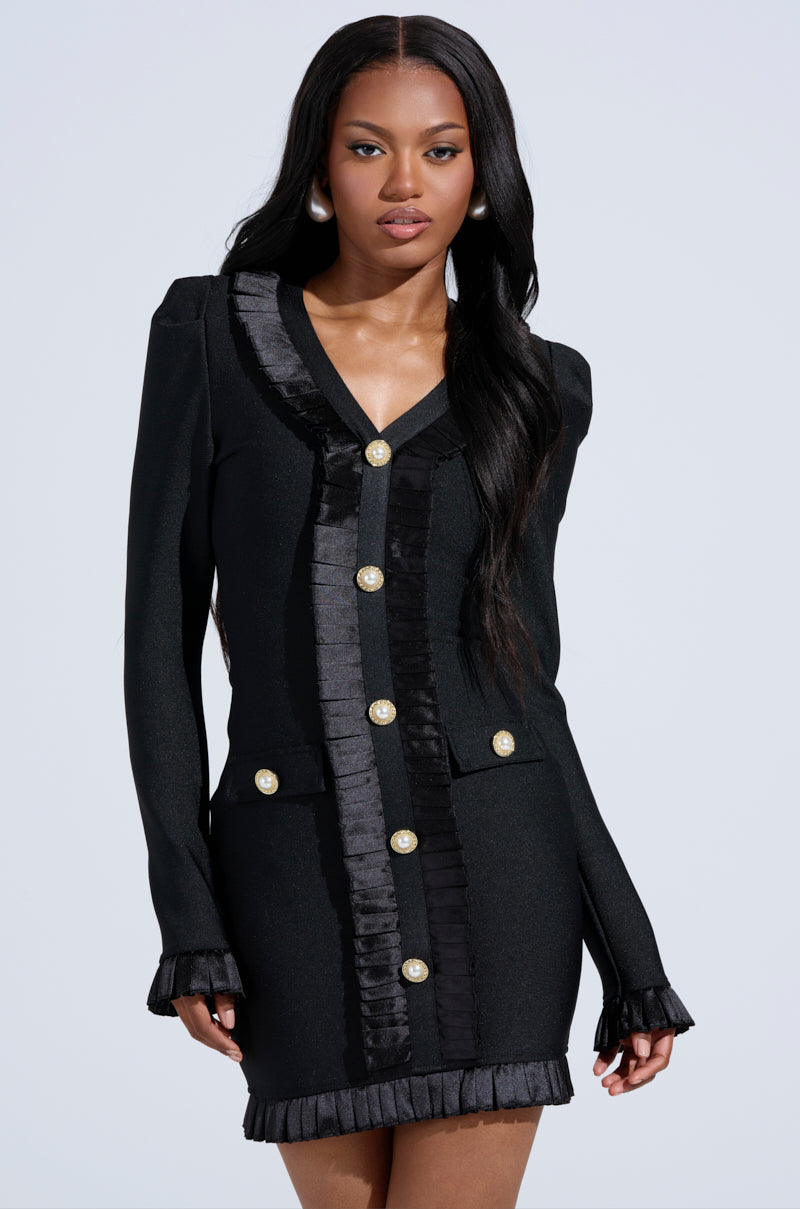 Refine your wardrobe with The AKIRA Label Sakura Bandage Ruffle Mini Dress. Featuring sharp shoulders. a V-neckline. and luxe pleated satin trim throughout. this sophisticated mini dress is finished with pearl-embellished buttons for an elevated touch. The tailored silhouette hugs your shape while the pleated accents at the hem and cuffs add texture and flair—perfect for your next chic affair or power move. Complete with a tonal back zipper closure.