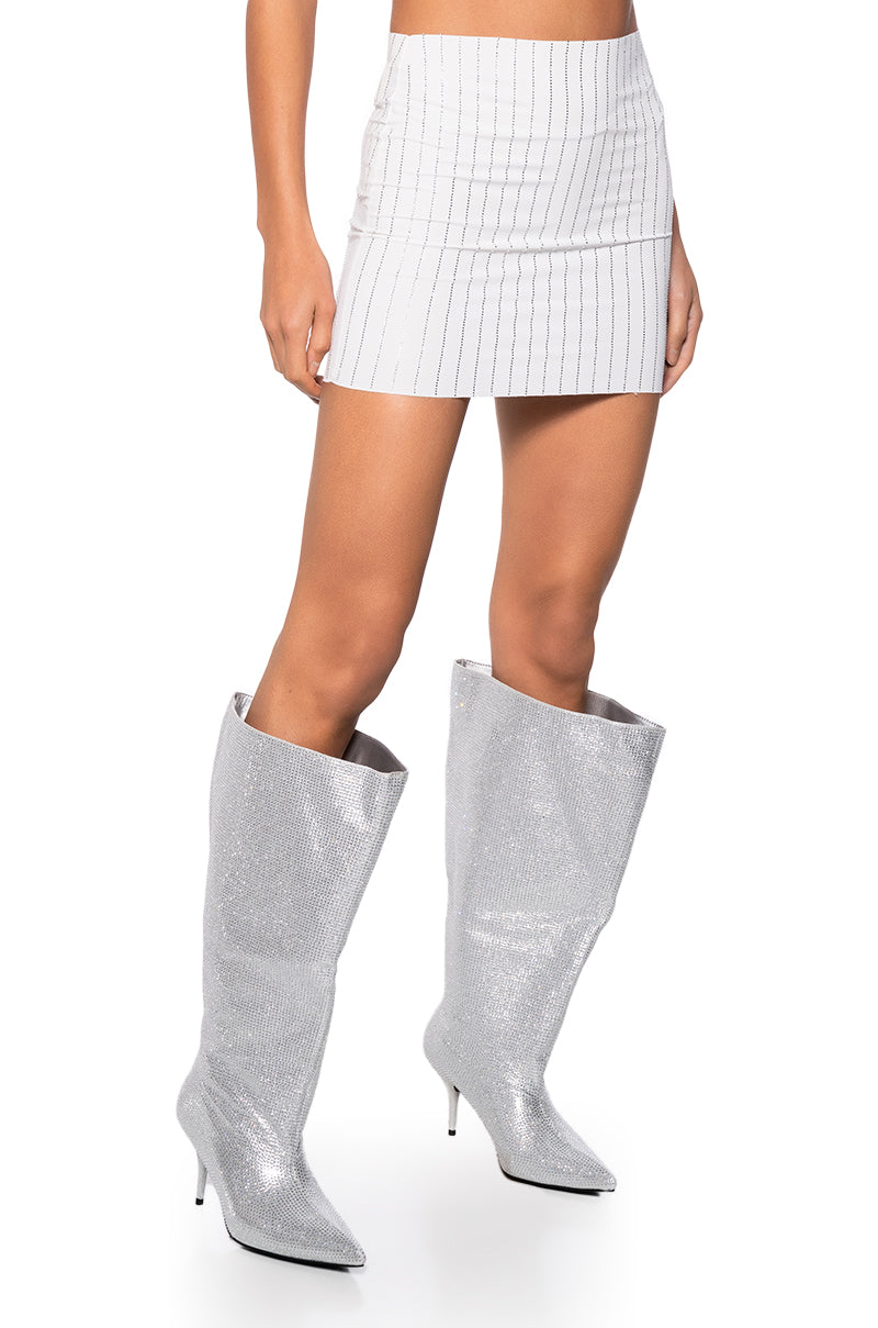 Looking mad angelic in The AWNIS Label Second Skin Rhinestone Mini Skirt In White! Designed from a stretchy. lightweight base fabrication. this sleek little number features a high- rise waist. a curve-worshiping fit. and a mini length silhouette with an easy slip-on design. Complete with vertical rhinestone embellished lining for a pop of sparkle. Work your styling techniques and pair with the coordinating top. The AWNIS Label Second Skin Rhinestone Tube Bralette In White.