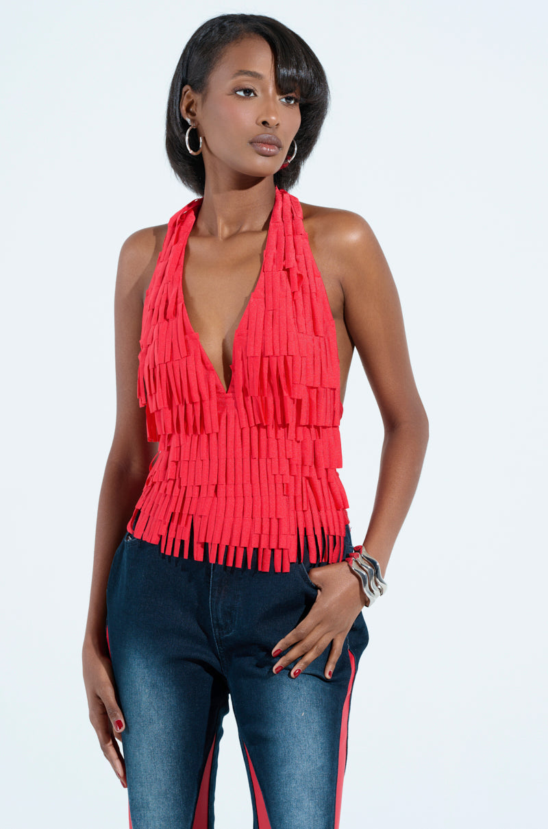 The dance floor is calling when you wear The AWNIS Label Shake It Top. This playful piece is crafted from a sleek. stretchy base and features thick. self-tie halter straps. a sleeveless design. a plunging v-neckline. an exposed back. and tonal rows of fringe detailing throughout. Complete with a metallic back zipper closure. a curve-hugging silhouette. and a cropped length. Pair with a mini skirt and platform pumps for a sizzling ensemble.