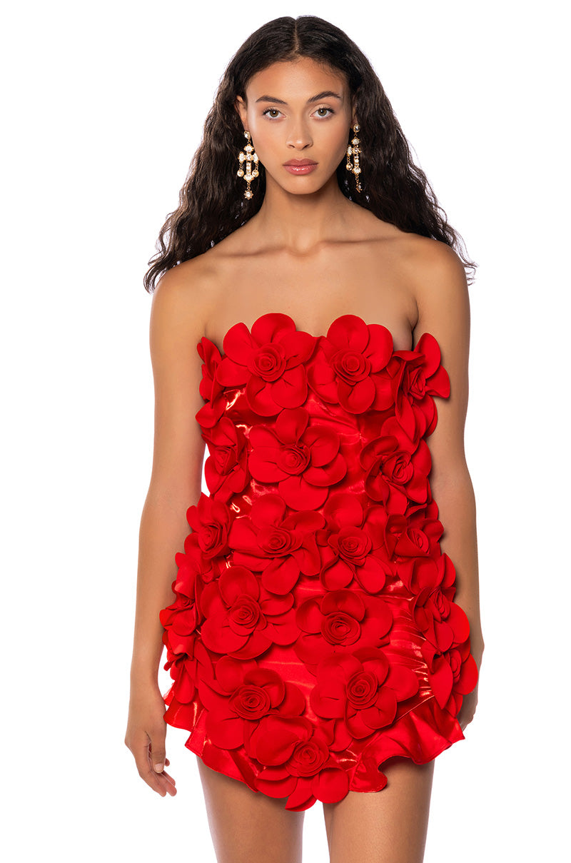 The AKIRA Label Shes A Masterpiece Floral Mini Dress features a non-stretch. satin base fabrication. a plush. scuba knit floral applique bodice. strapless silhouette. and a mini length. Complete with a smooth inner lining. ruffled trim hem. and a concealed side zipper closure. Pair this piece with wide leg bottoms and pumps for a sexy. evening look.