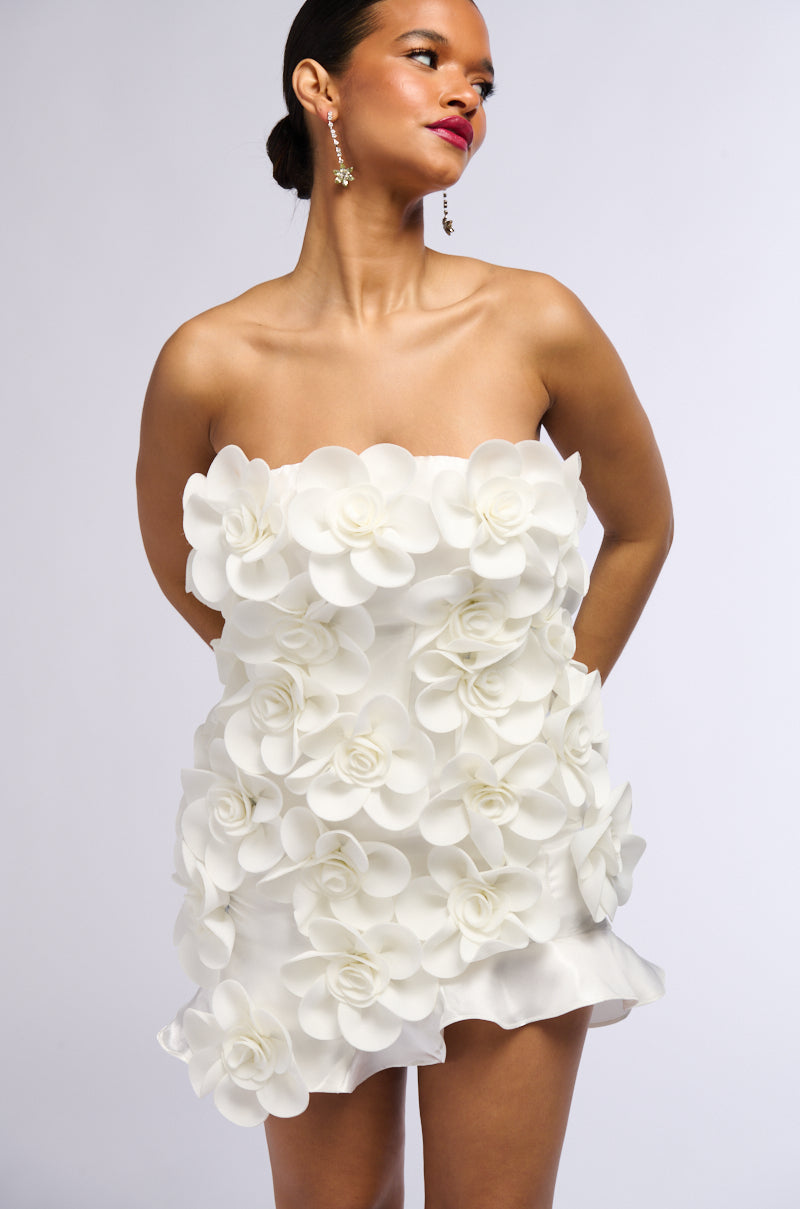 The AKIRA Label Shes A Masterpiece Floral Mini Dress features a strapless neckline. a shimmering satin base. a flirty ruffled mini hemline. and 3D scuba knit floral applique detailing throughout. Complete with a concealed side zipper closure. a smooth inner lining. and an elasticized inner trim. Style with chic mules and an embellished clutch to complete your party-ready look!