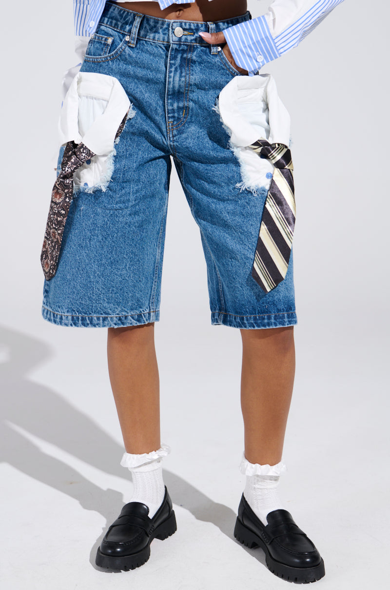 Boss up in The AWNIS Label Standing On Business Bermuda Short. A playful take on business casual. these bottoms are crafted from non-stretch cotton denim in a medium wash. They feature a high-rise fit. functional belt loops. a classic five-pocket design. and two dangling tie appliques on the thighs with attached poplin collars. Complete with a standard button-zip front closure. and a bermuda silhouette. Pair with the AWNIS Label Casual Friday Cropped Button Up Shirt. frilly ankle socks. and platform loafers for a polished finish.