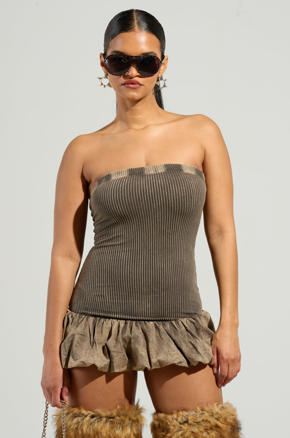 The AKIRA Label Stay With Me Mini Dress is a sweet style that is crafted from a stretchy. cotton knit base and features a subtle washed colorway. a strapless elasticized neckline. a ribbed knit bodice. and a structured. ruched bubble mini skirt. Complete with a bodycon fit. a mini length. and an easy. pull-on design. Pair with platform pumps. a bold lip. and a shoulder bag for a finished look.