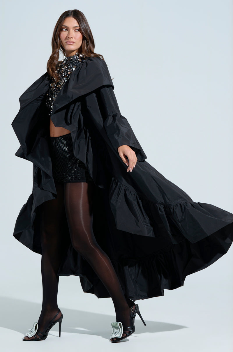 Fashion speaks louder than words. The AWNIS Label Talk To Me Blouse is crafted from a lightweight. sleek fabrication and features a duster-like silhouette. an open front with flamboyant ruffle trim including on the bottom hem. long bell sleeves with coordinating ruffle hemlines. and a longline. flowy fit. Pair with corsets and mini skirts to make a bold statement wherever you go.