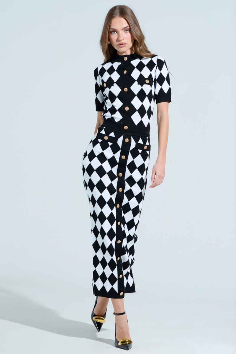 You'll definitely want to have The AWNIS Label The Best Part Maxi Skirt in your wardrobe. This refined piece is crafted from a stretchy. curve-hugging knit base and features a classic argyle pattern. a high rise design. a ribbed knit waistband. mock upper waist pockets with embossed faux gold metallic button detailing. and coordinating metallic mock button accents running down the center of the front. Complete with a bodycon silhouette. a maxi length. and an easy. pull-on fit. Pair it with the coordinating AWNIS Label The Best Part Button Down Top. kitten heels. and hoop earrings for a sophisticated look.